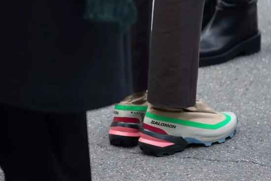 但故事的转折点发生在时尚界。大概十年前,一些眼光独到的巴黎买手店发现,有潮人开始把Salomon的功能性越野鞋,搭配着复古时装来穿,效果出奇地酷-7。这启发了Salomon,他们开始尝试与MM6 Maison Margiela、JJJJound这类先锋时尚品牌联名-3-9。
