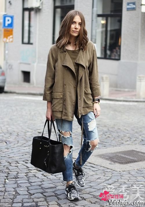 牛仔绿外套休闲感十足,搭配条纹衫和白色裤子,打造法式休闲风。或者内搭连帽卫衣,增加层次感。