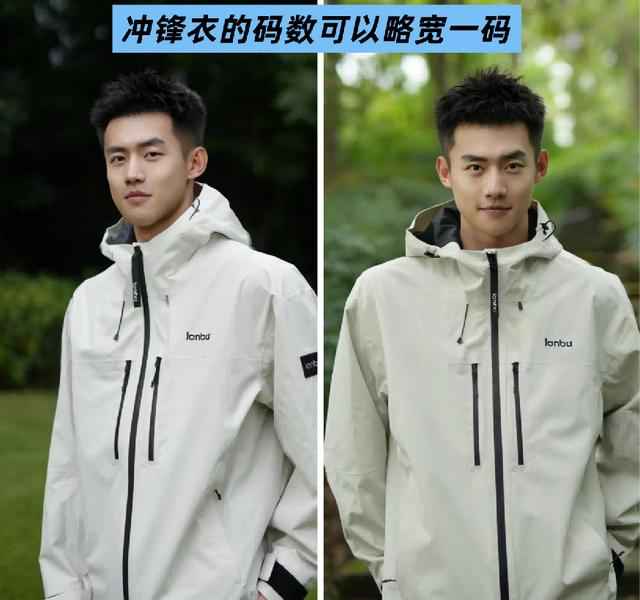 选择箱型裁剪的冲锋衣——下摆是平行设计,侧面看像个小盒子,巧妙隐藏腹部。