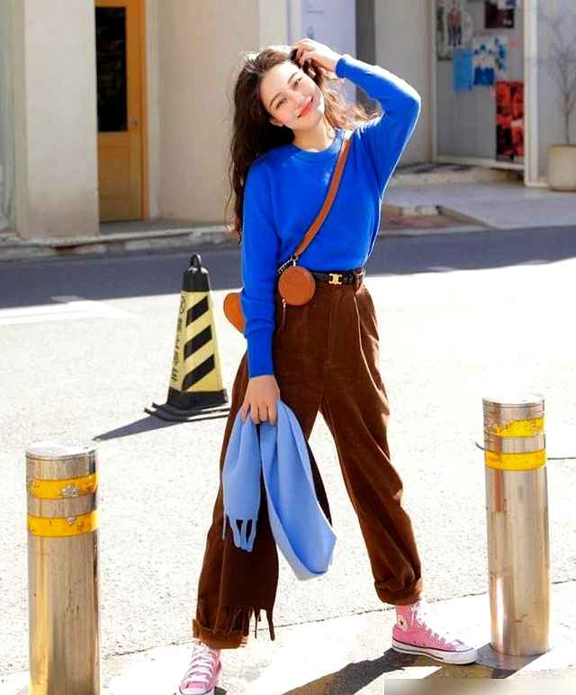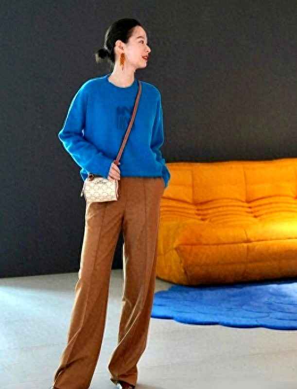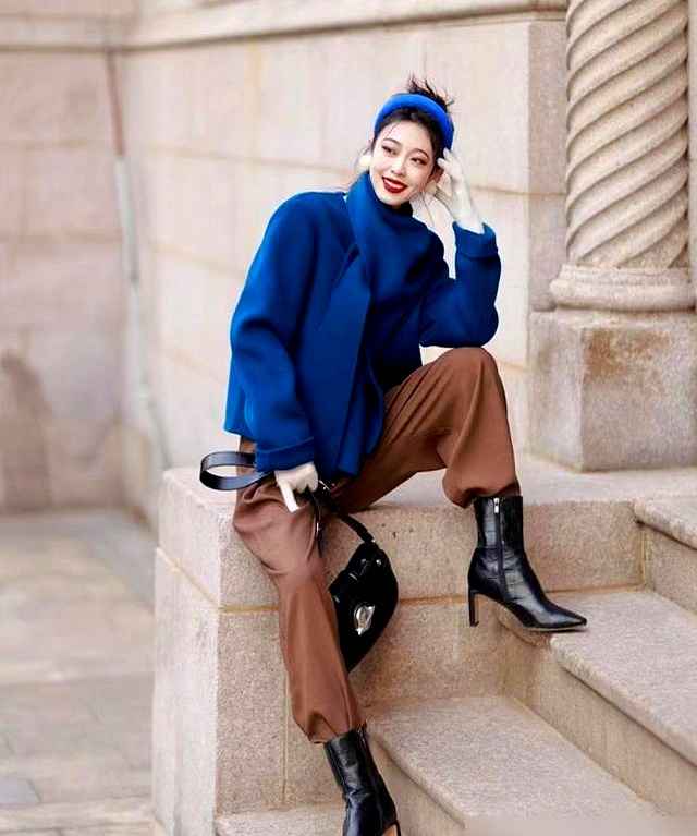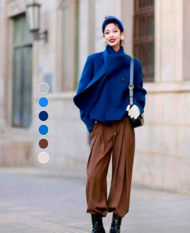 现在我有经验了:棕色打底,蓝色点缀也很稳。比如纯棕大衣配蓝围巾,棕包加蓝边,或者穿双蓝袜子露一截,都能打破老气。很多人衣柜里都有蓝棕单品,就是没想过搭一起。我妹从江苏回来,看我穿棕大衣配蓝帽子,直接说:“诶,这次像样了哦。”