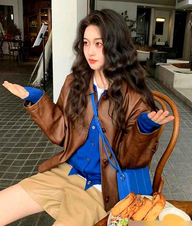 那天在咖啡店,我看着那姑娘靠窗坐着,手里端着拿铁,手机放在桌上偶尔点一下。她的头发是染过褪色的棕,有点随意,不是刻意打理的那种精致。蓝棕配色在她身上显得很自然,衣服看起来不新,但整体有种“这人身价不高,但会穿”的感觉。