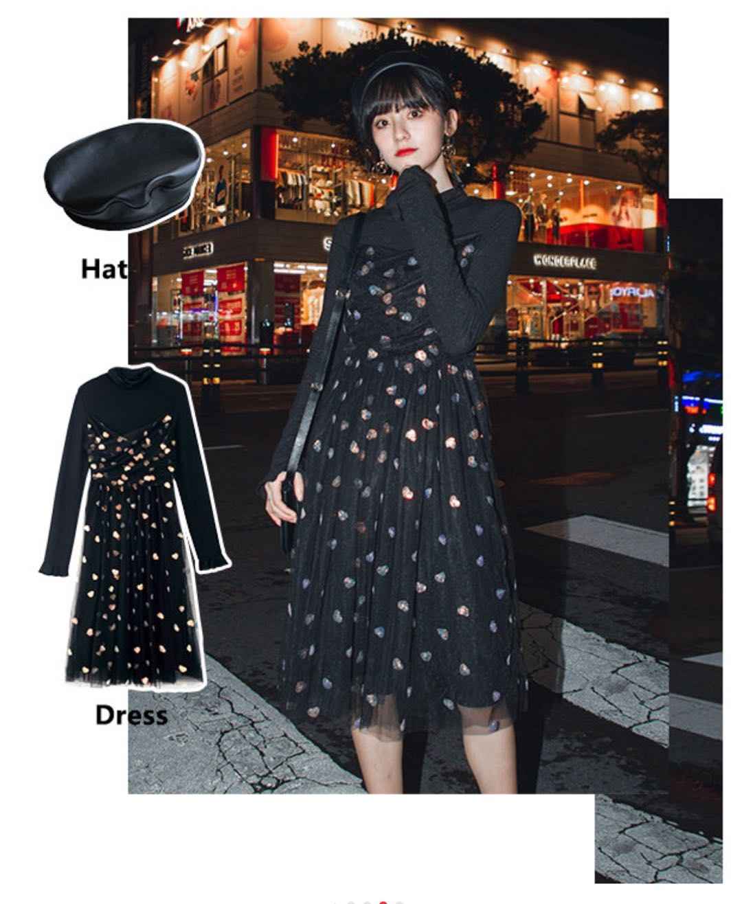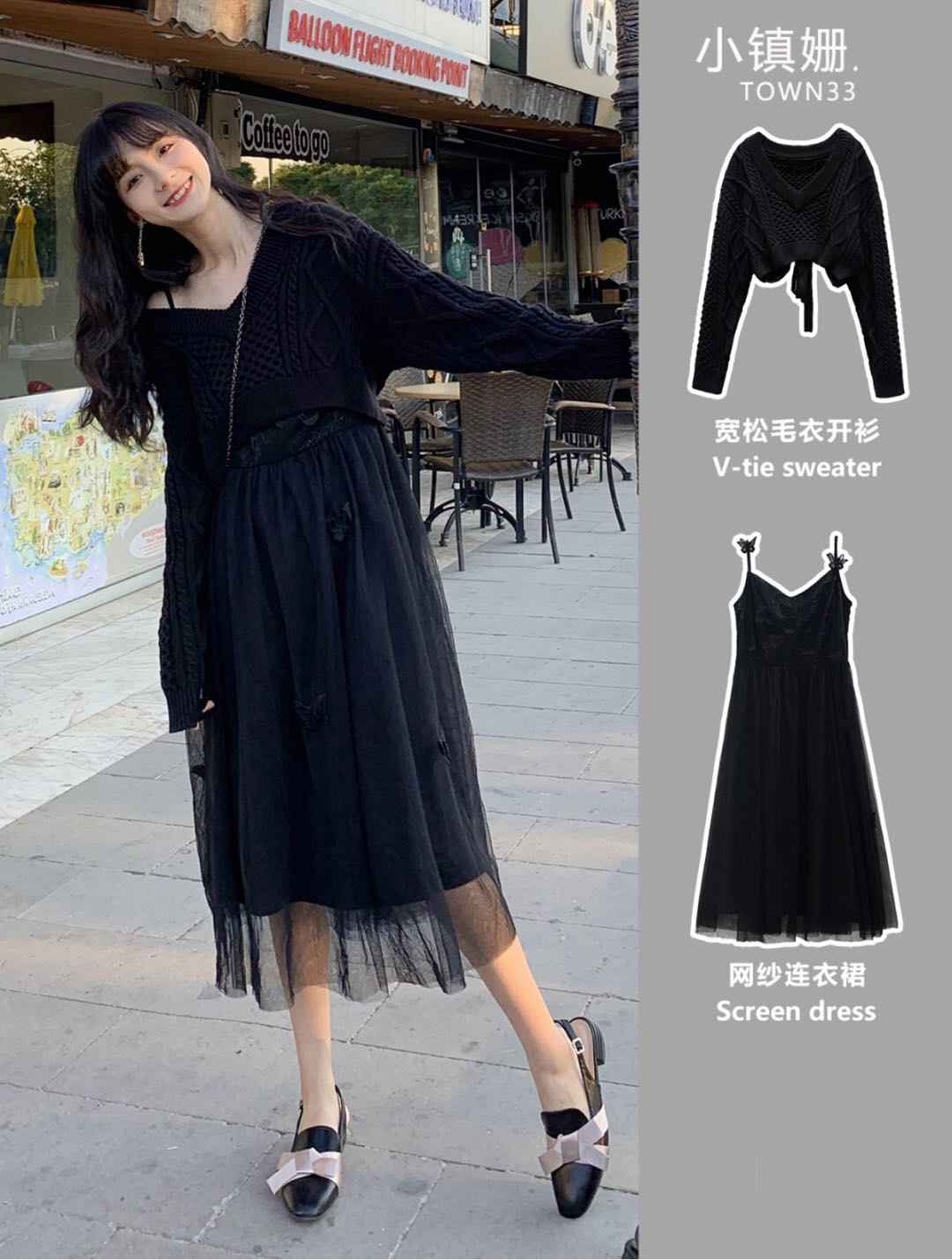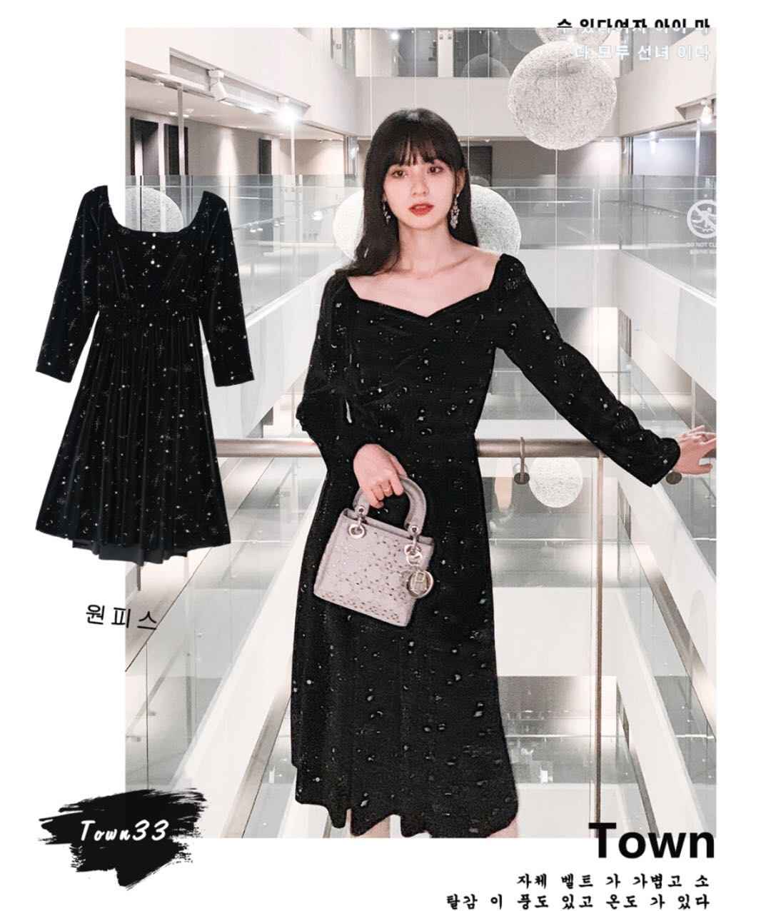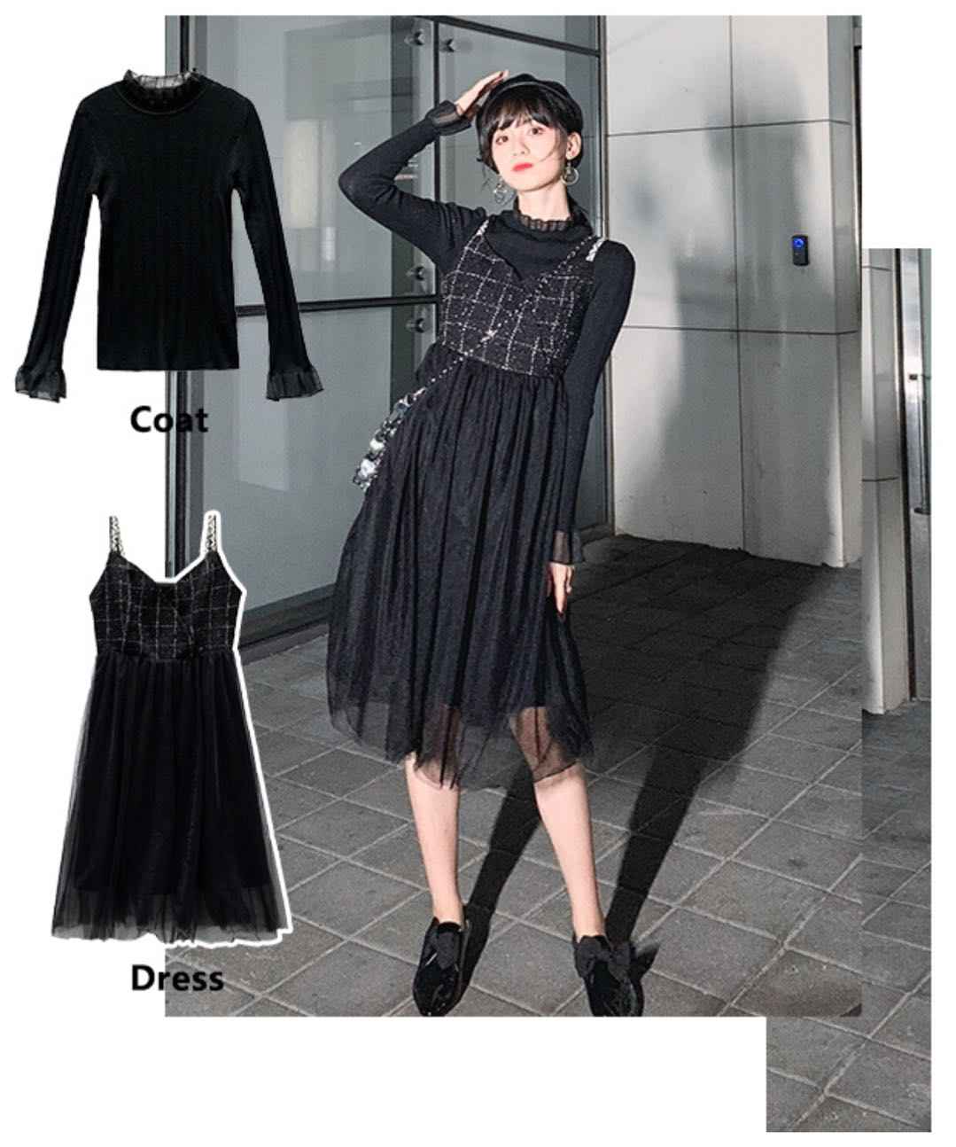 黑色打底 + 连衣裙,吊带裙一衣多穿,细闪设计夜场最亮眼