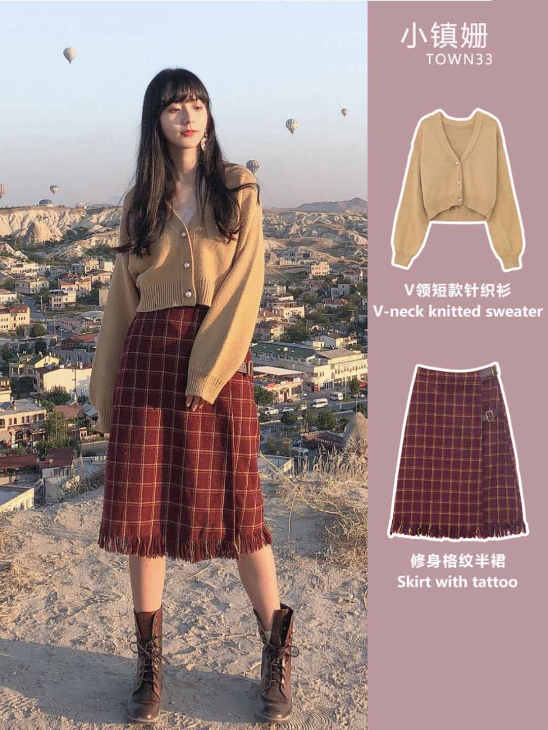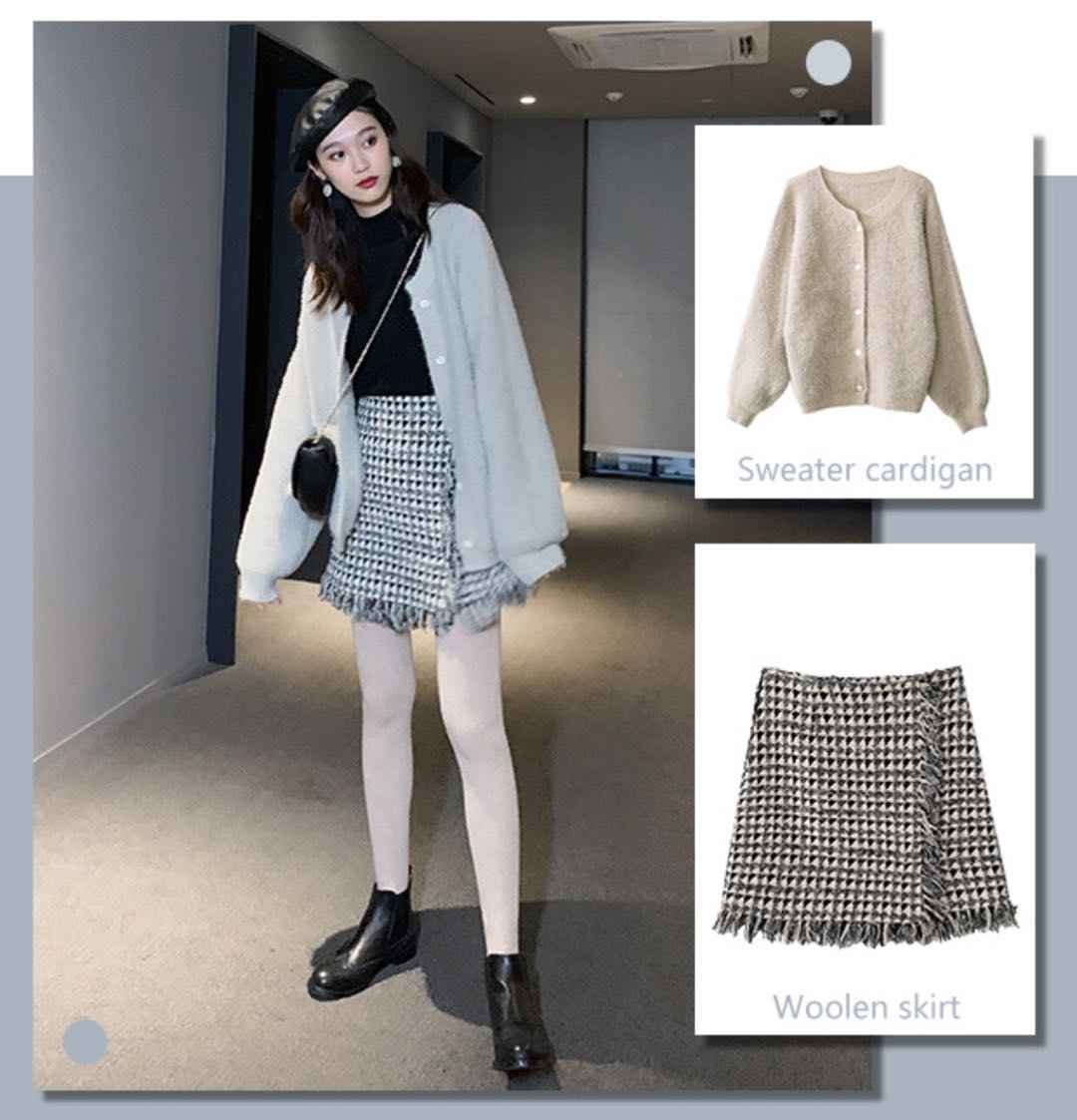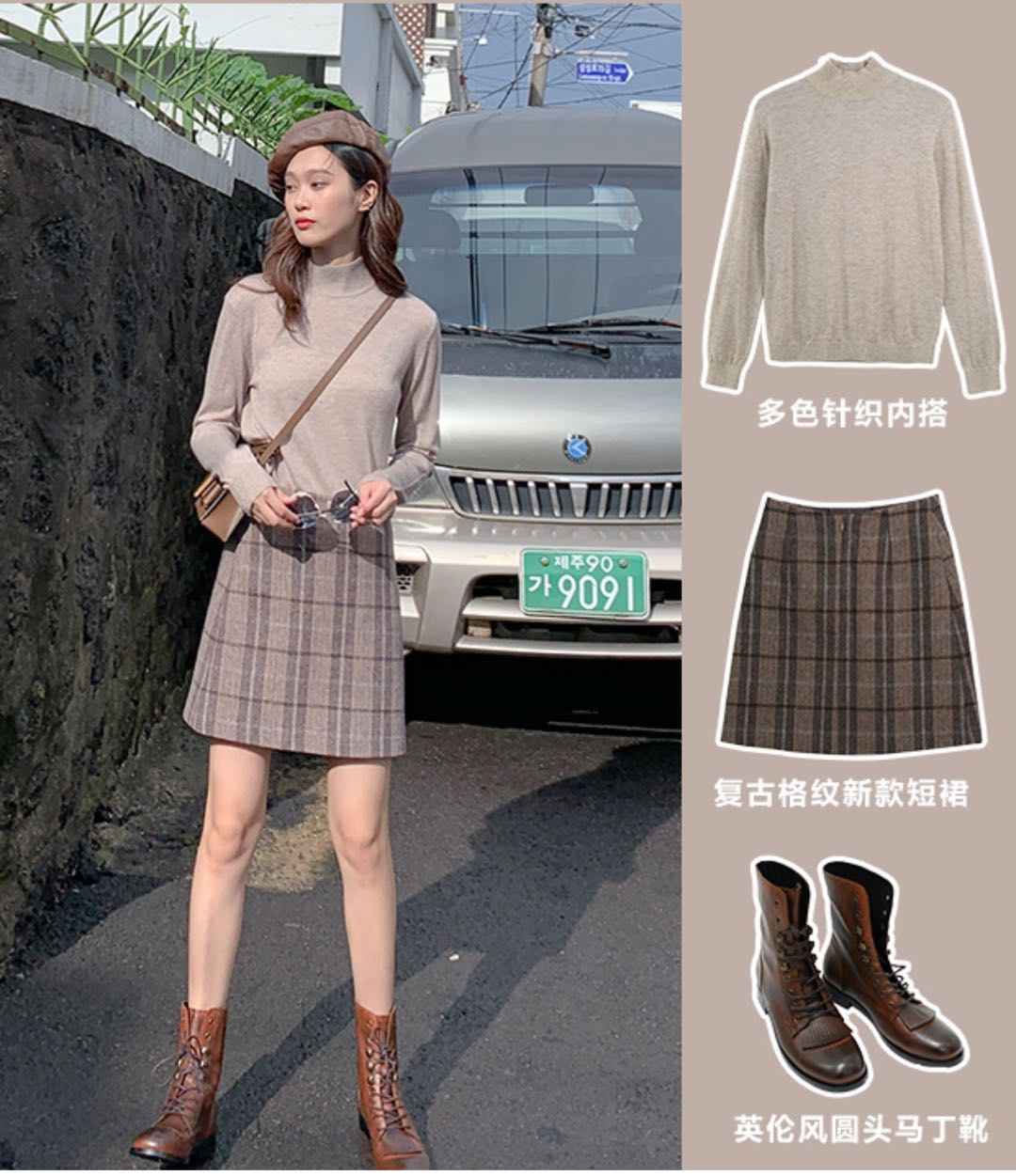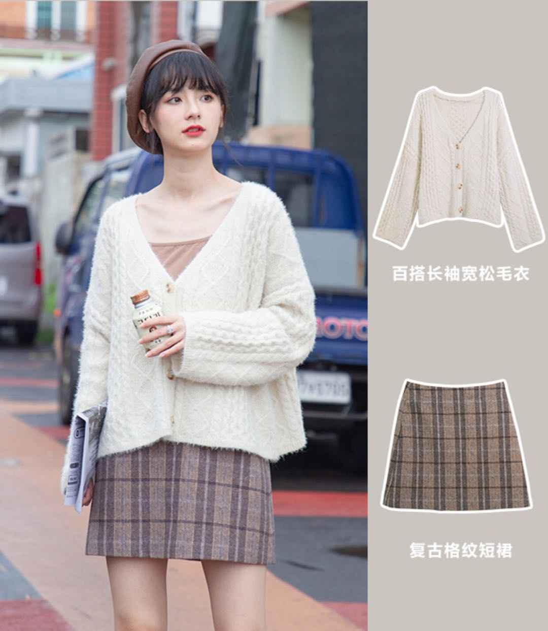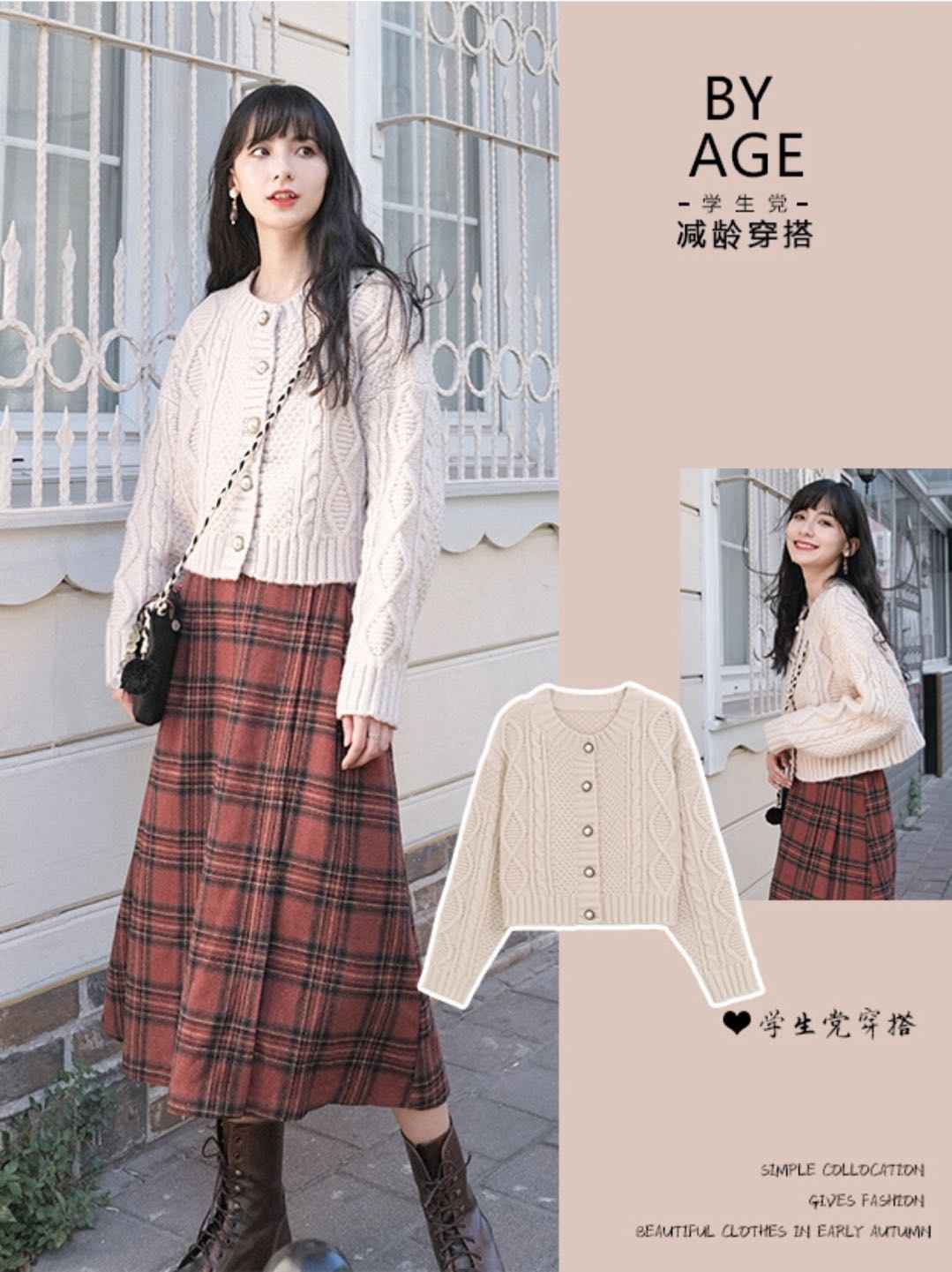 毛衣外套 + 格子中长裙,复古学院风经典款,怎么穿都不出错