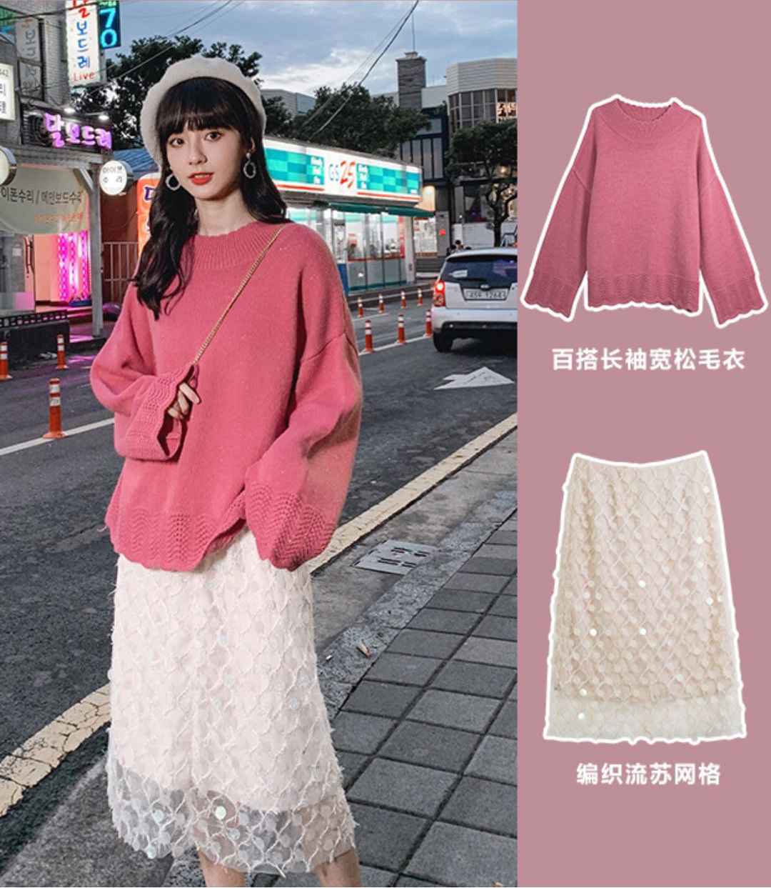粉色上衣 + 闪片半裙,初秋穿活泼又可爱,亮片裙超抢眼