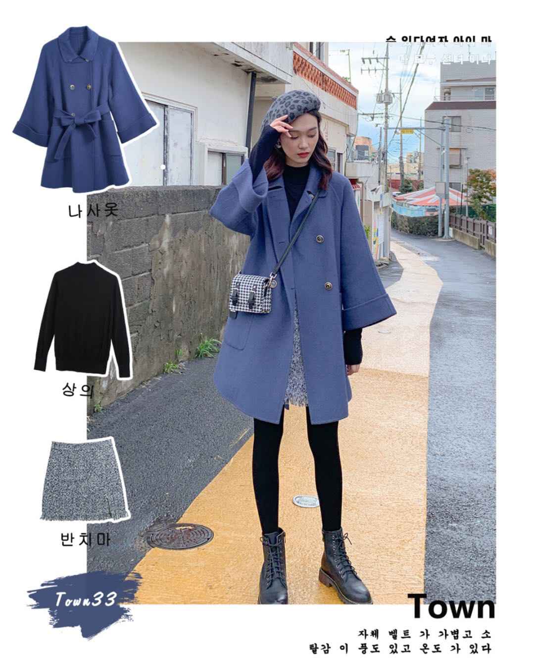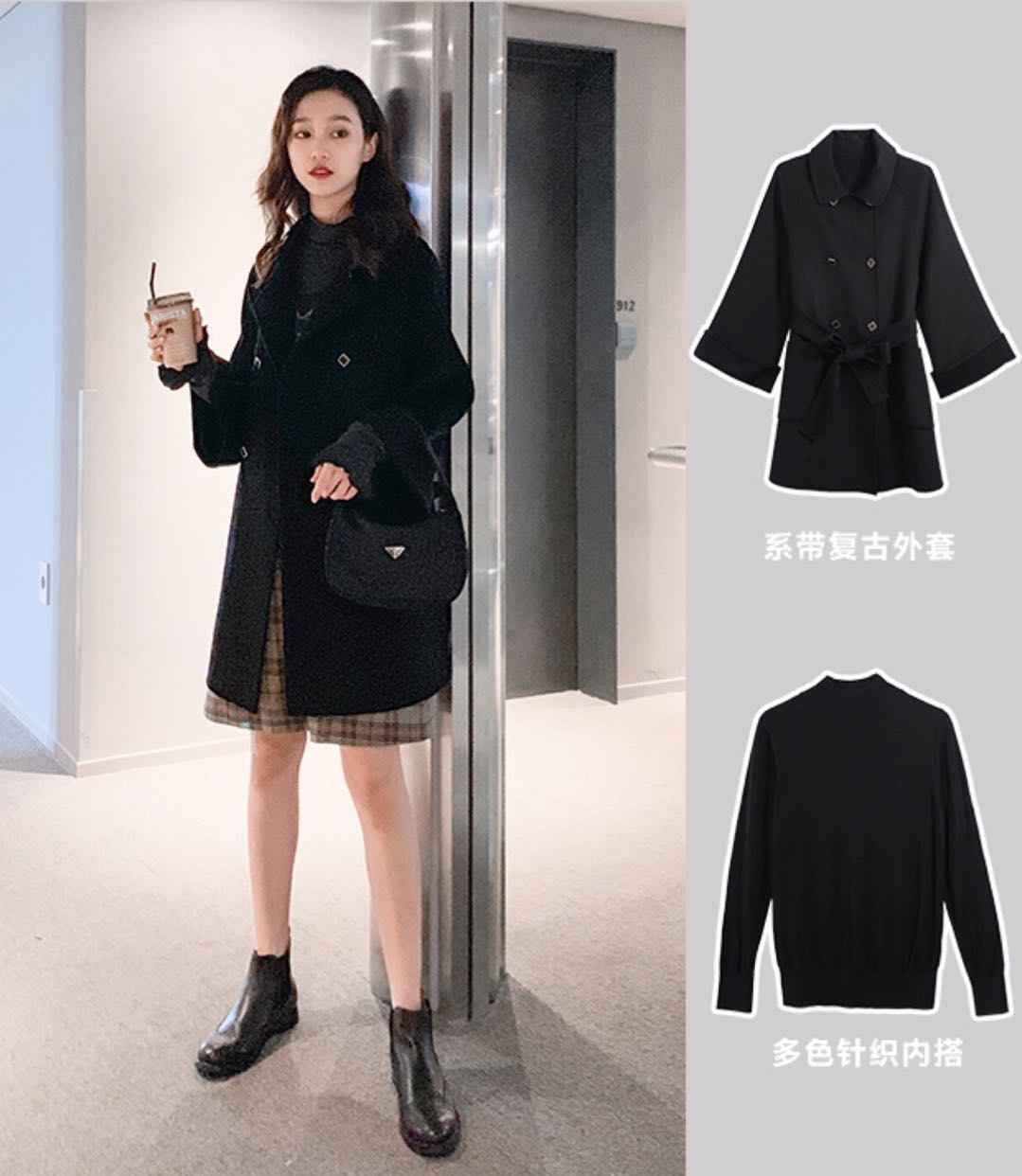 蓝色大衣 + 黑色上衣 + 流苏半裙,气质名媛套装,娃娃衫大衣藏肉