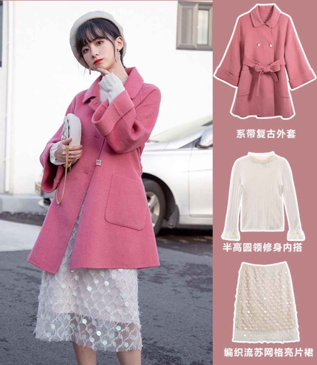 闪片半裙像美人鱼一样吸睛,配粉色呢子外套超减龄,瞬间变甜妹