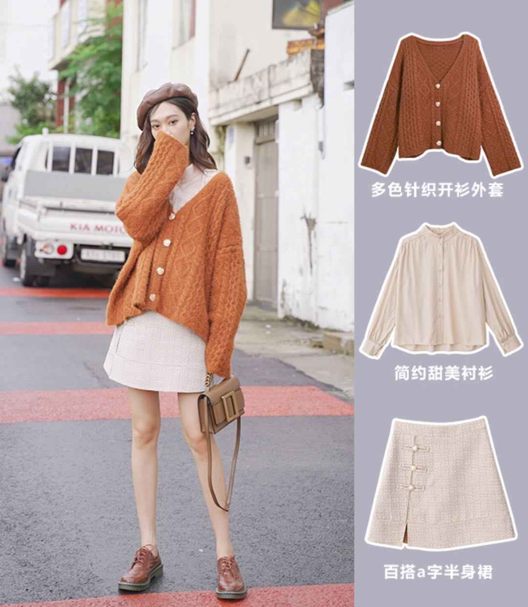 浅咖啡色配米白、驼色系包包最协调,暖色调呼应秋日氛围,深色包则增加稳重感。