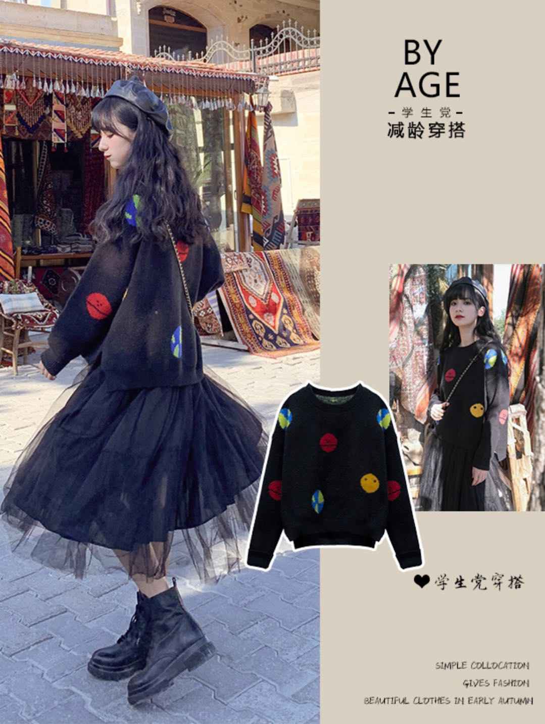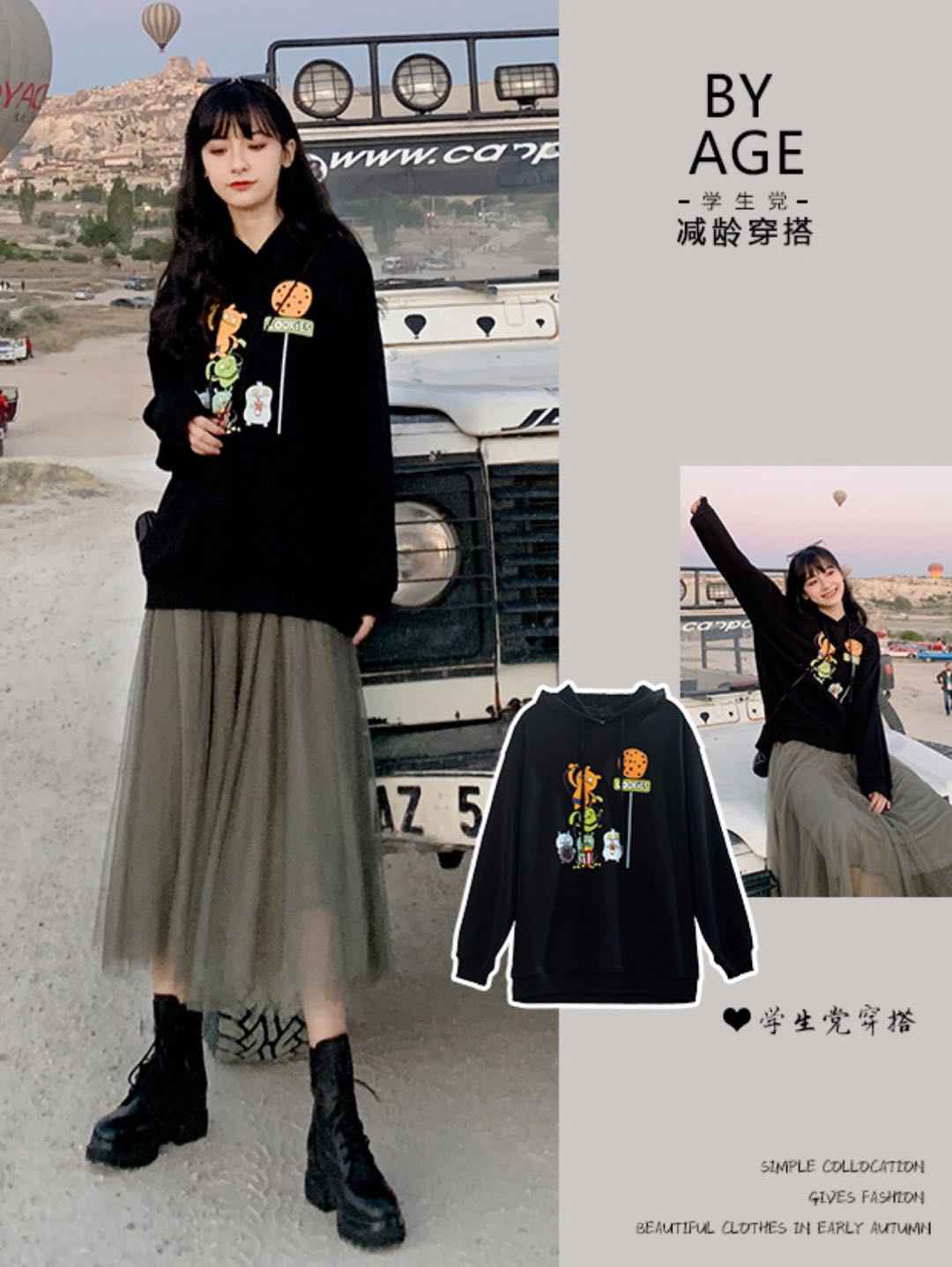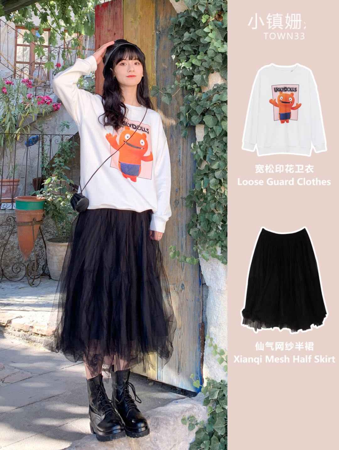 彩色卫衣 + 灰色纱裙,趣味穿搭少女感满满,宽松版型对微胖女生友好