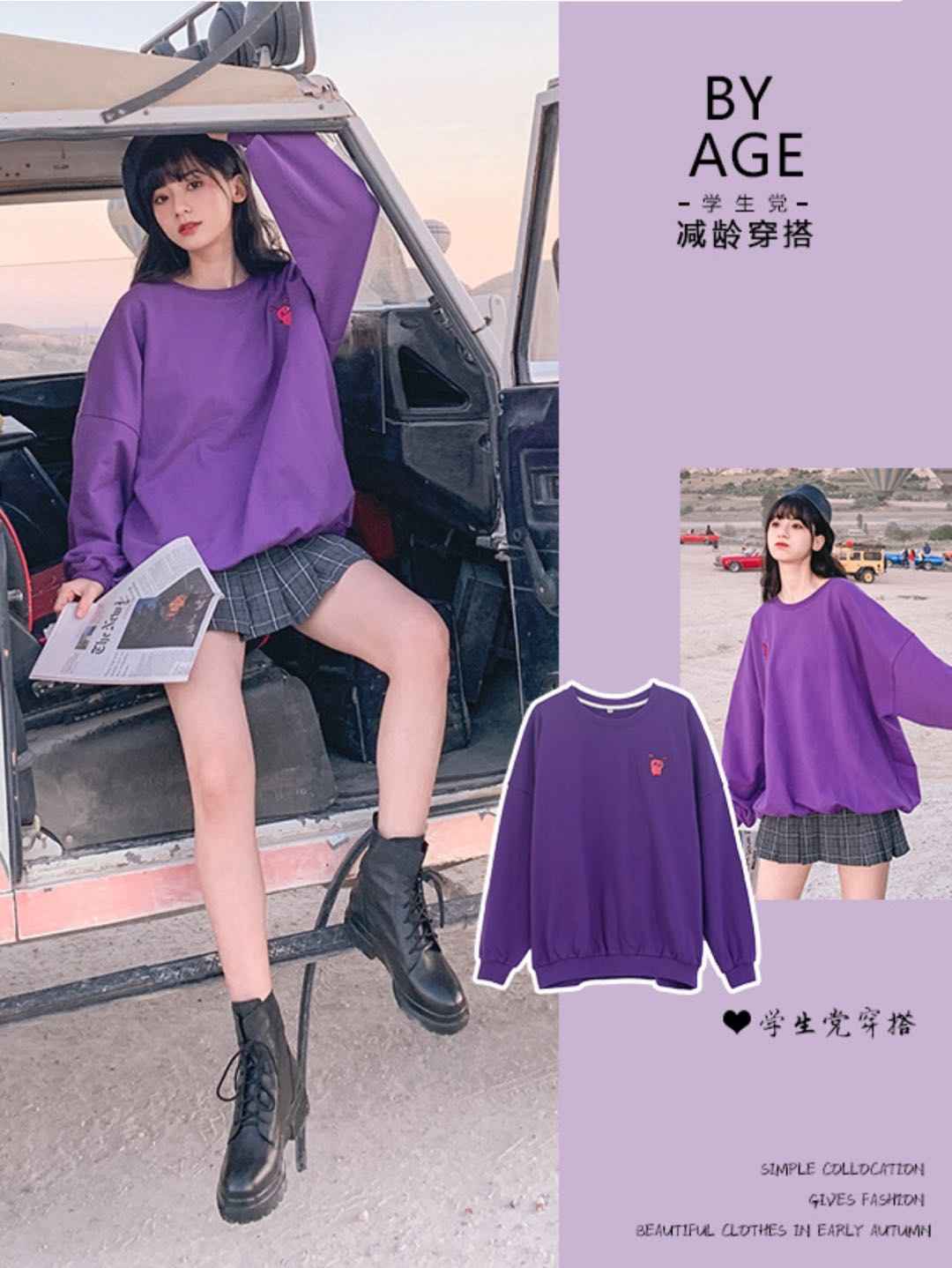 紫色卫衣 + 半裙,少女心配色,深紫色超显白