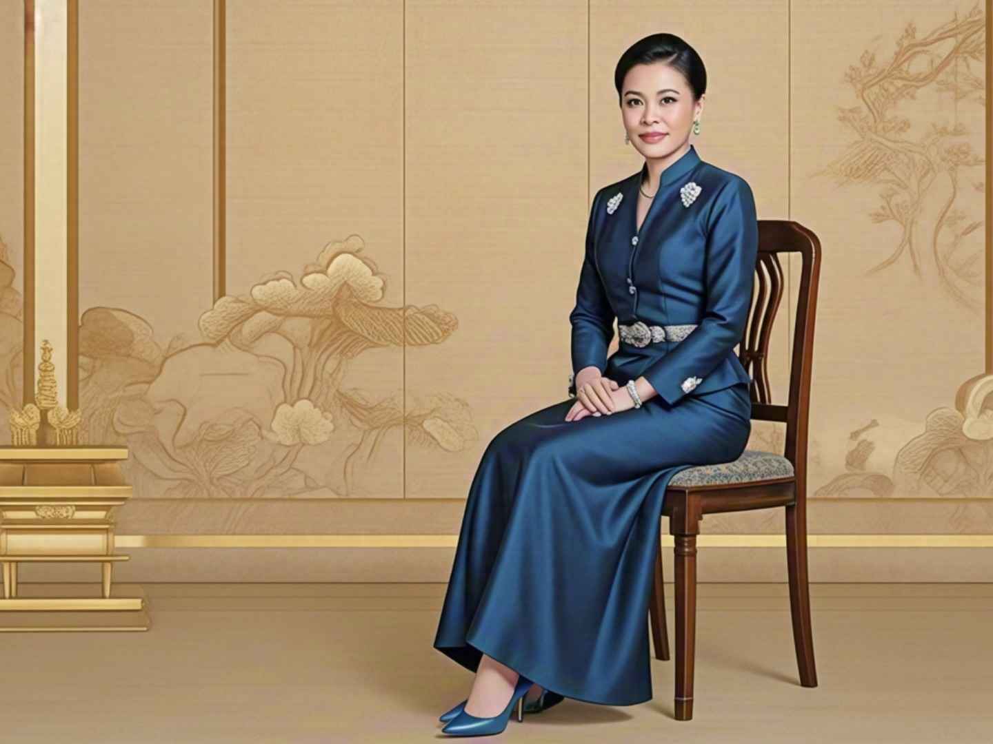 苏提达王后穿搭惊艳全场,蓝色丝绸礼服尽显王室风范