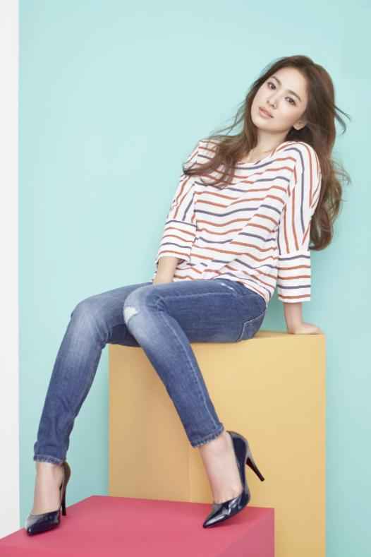 基础款牛仔裤也能穿出彩,宋慧乔用紧身牛仔裤搭条纹上衣,休闲又舒适。松紧结合的设计修饰身材,夏天穿清凉又时尚,赶紧学起来吧。