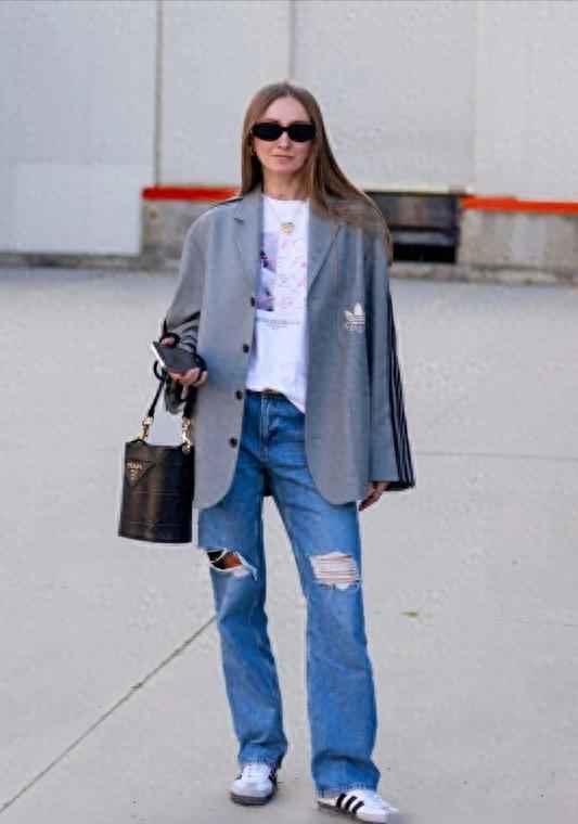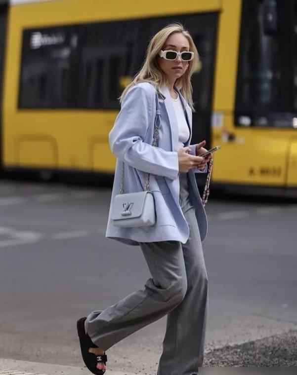 用蓝色点缀灰色系,不会太抢眼,却能提升精致度。具体搭配上,基础款也有升级:白皮肤可以选冰川蓝上衣配珍珠灰下装,用水光缎面料增加光泽;黄皮肤试试钢灰西装搭做旧牛仔裤,破洞设计打破正式感。