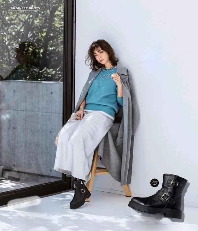 职场通勤推荐三层叠穿:白衬衫加蓝色针织衫,再套灰色大衣,保暖又专业。配饰上,银灰耳环和蓝宝石吊坠是秋冬亮点,鞋包选灰蓝拼接款,比如毛呢和PVC混搭,保持色调统一又有层次。