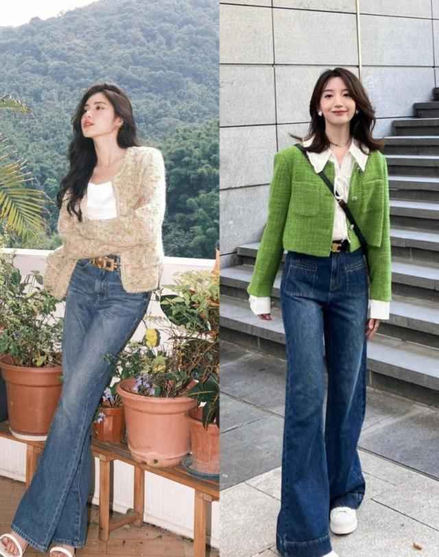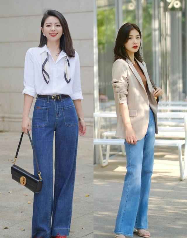 牛仔裤版型多,直筒、阔腿、微喇等都受欢迎。除了高跟鞋,可以配运动鞋、平底鞋或靴子,每种风格不同,休闲或正式都能驾驭。