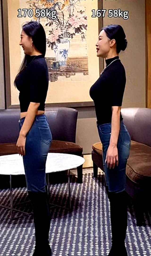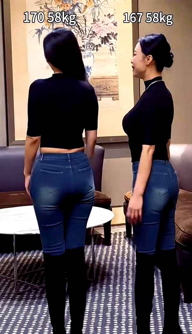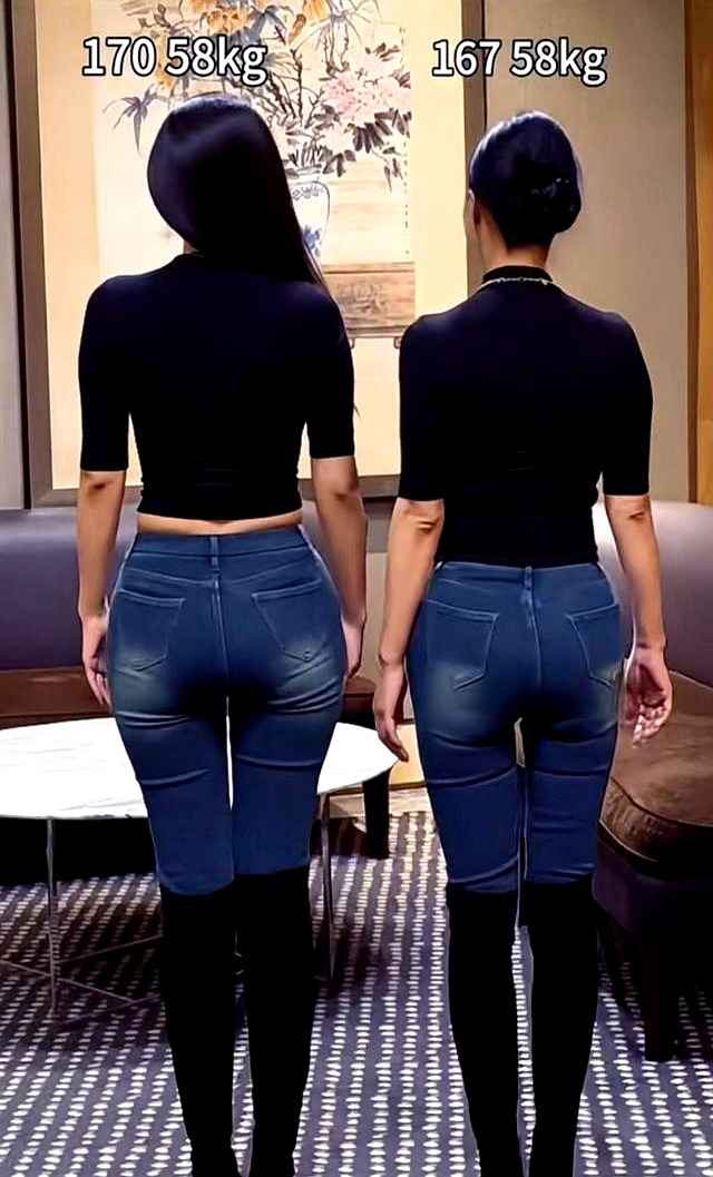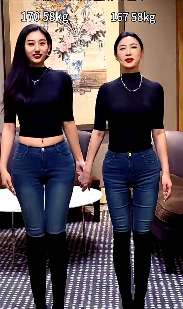 回到视频里,两人站在同样的灯光下,170女儿的肩膀比167妈妈高出3厘米,但镜头从低角度仰拍,妈妈悄悄踮起脚尖,靴子在镜头里瞬间高了2厘米。拍摄的人很懂怎么弥补视觉差距,也明白观众想看的不是身高,而是“我到了她这个年纪还能不能穿出这种感觉”。女儿把黑针织衫下摆塞进裤腰,腰线提到肋骨位置,这是20岁年轻人的穿法;妈妈则把下摆放出来,前面随意半塞,衣角遮住小腹,再配一条深色牛仔裤,颜色对比把身体分成上下两部分,年龄感一下子就减低了。观众如果只比腿长,就中了导演的圈套,真正的比拼是“谁看起来更轻松自然”。
