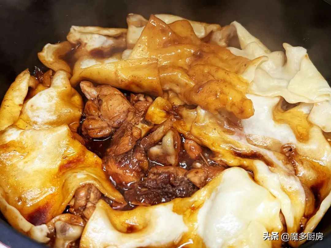 做法:鸡腿剁成小块,洗干净后焯水去血沫,捞出来备用。炒锅烧热放油,放八角炒香,下鸡块翻炒变色,加姜片、葱花和大蒜炒匀。倒入生抽酱油、花雕料酒和红烧酱油,翻炒上色,如果味道不够再加点盐。加热水煮开,转小火焖熟鸡块,加辣椒段炒匀。 meanwhile,面粉加水揉成面团,醒发后做成小饼,贴在锅边和菜上,盖上锅盖焖10分钟,饼子熟了就能吃!