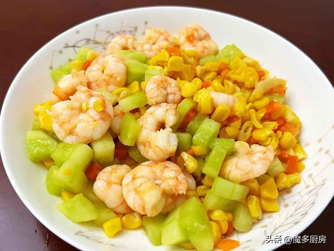 做法:鲜虾剥出虾仁,用料酒腌5分钟去腥。甜玉米粒准备好,胡萝卜和黄瓜去皮切丁。炒锅烧热倒油,放姜丝炒香,先下胡萝卜丁和玉米粒翻炒,加盐调味。等玉米粒熟了,放虾仁炒到变色,再加黄瓜丁快速翻炒。最后用玉米淀粉加水调成芡汁,淋进去收浓汤汁,就可以装盘了!