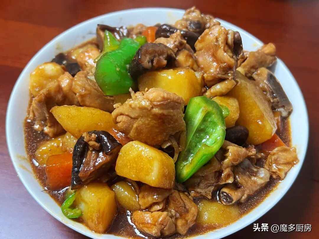 做法:鸡肉剁成块,洗干净后,开水里放点料酒,下鸡块焯出血沫,捞出来用热水冲一下。干香菇提前泡发,香菇水留着备用。炒锅烧热倒油,放大蒜和姜片炒香,加黄焖酱炒到冒泡,下鸡块翻炒均匀,让酱汁裹满。倒入花雕料酒和香菇水,水量没过鸡块,盖上锅盖焖10分钟左右。然后放土豆块、胡萝卜块和香菇块,再焖10分钟,等到土豆软糯,鸡肉入味,加青椒块翻炒几下,收汁出锅!