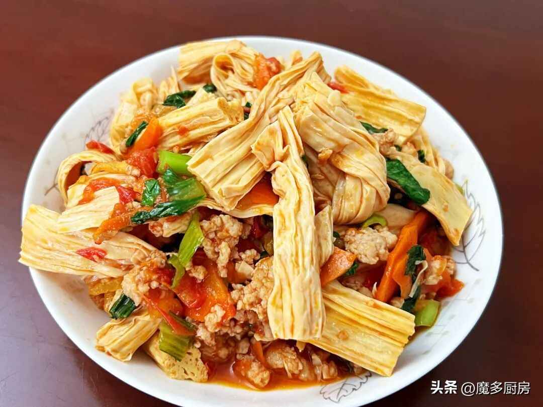 做法:干腐竹用清水泡软;猪肉剁成馅,番茄切丁,青菜切段。炒锅烧热倒油,放肉馅和姜丝炒散,加生抽酱油调味。然后放胡萝卜片和番茄丁,炒到番茄出汁,加盐调味。加入泡好的腐竹翻炒均匀,焖煮入味,最后放青菜段炒熟,收汁出锅!