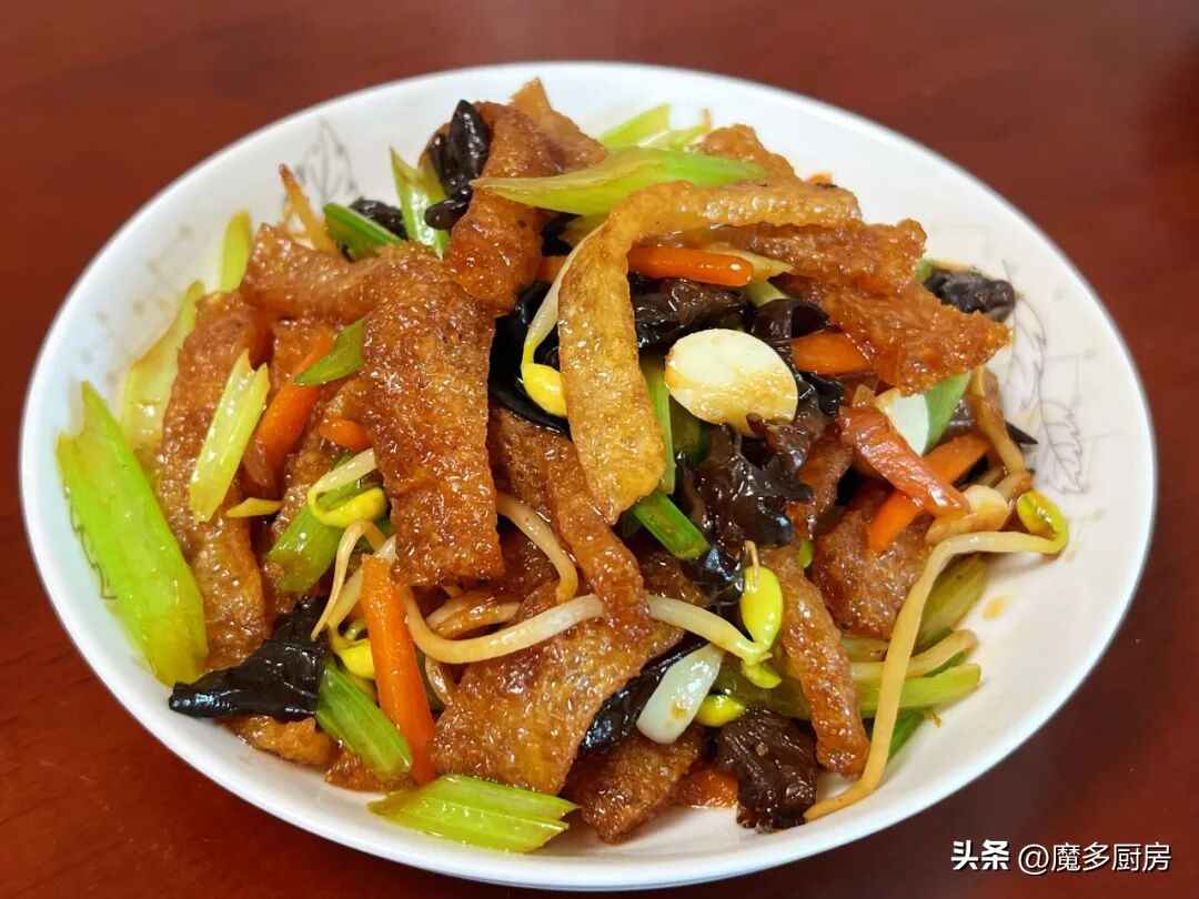 做法:皮肚和黑木耳泡发后焯水2分钟,切小段备用。炒锅烧热倒油,放大蒜、姜片、葱花和胡萝卜丝炒香,放皮肚和黑木耳翻炒1分钟。加黄豆芽炒匀,倒入生抽酱油、蚝油、料酒、白胡椒粉、盐和白糖调味,最后放芹菜段炒熟出锅!