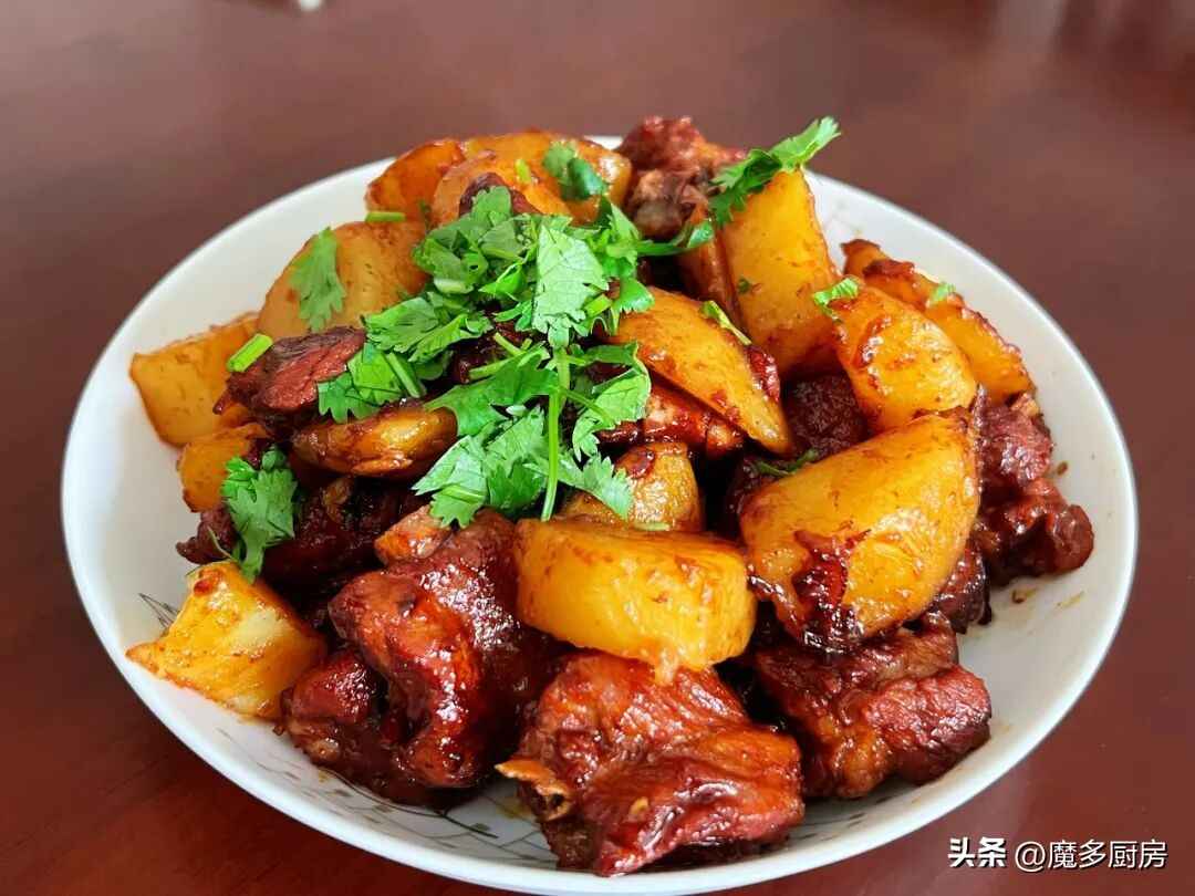 做法:排骨剁块洗净,焯水去血沫,用热水冲一下。炒锅烧热倒油,放葱花、姜片炒香,下排骨炒到微焦,加红烧王酱料翻炒上色。加热水没过排骨,盖盖焖煮45分钟,然后放土豆块,再焖到土豆软烂,大火收汁,撒香菜出锅!