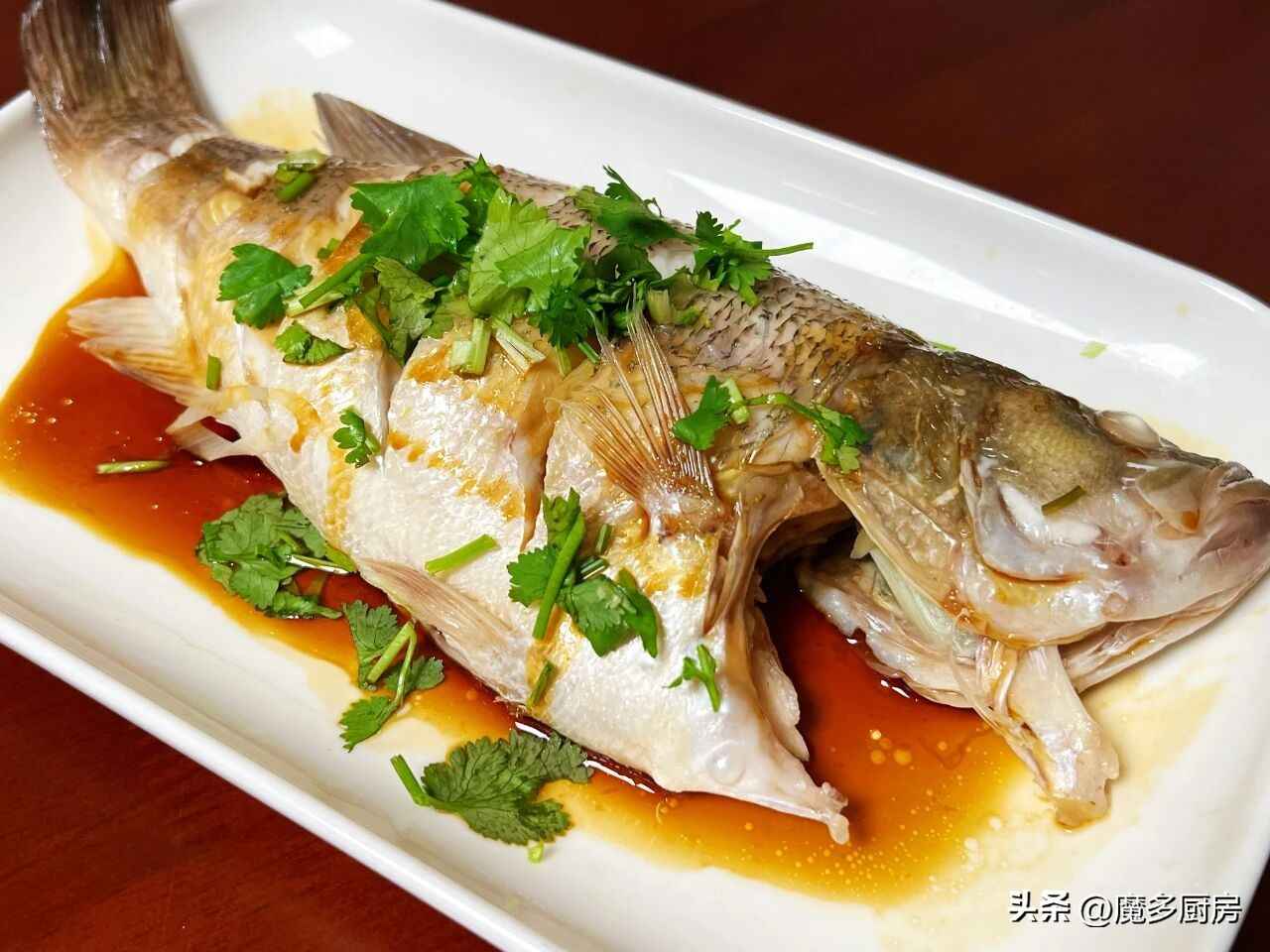 做法:鲈鱼处理干净,用葱丝、姜丝、花雕料酒和盐腌10分钟。蒸锅水开,鱼蒸13分钟,取出后倒掉汁水,淋生抽酱油,撒香菜上桌!