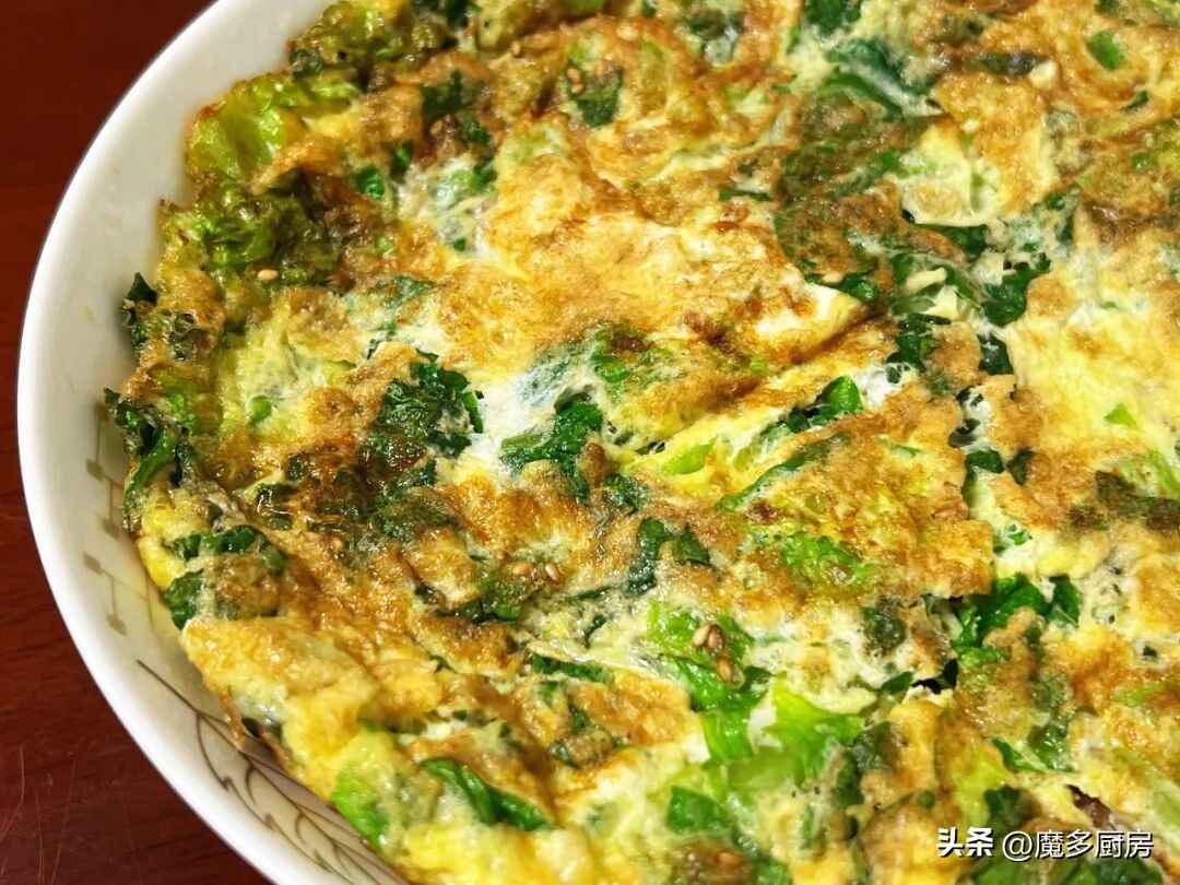 做法:生菜洗净切碎,加鸡蛋和盐搅匀。炒锅烧热倒油,倒入蛋液摊平,撒白芝麻,两面煎熟就行,简单又营养!