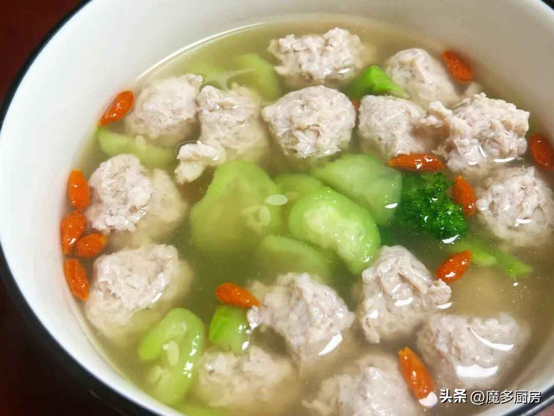 做法:猪肉剁馅,山药切碎,混合后加葱姜水、生抽酱油、盐和白胡椒粉搅匀,能成团就行。锅里烧水,一边加热一边把肉馅挤成丸子下锅,水开丸子浮起。加丝瓜块、枸杞和西兰花煮开,味道淡的话再加点盐,汤鲜味美!