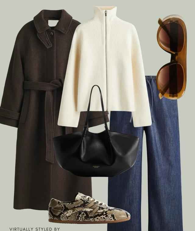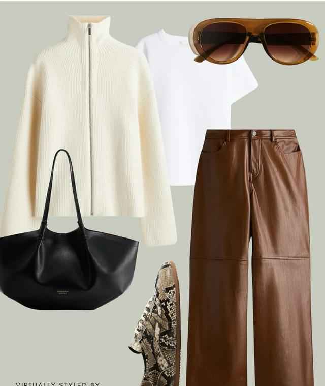 办公室穿搭里,“H型大衣配半高领和弯刀裤”是经典组合,或者用奶油白拉链毛衣搭直筒皮裤,温柔又职业,通勤不出错。