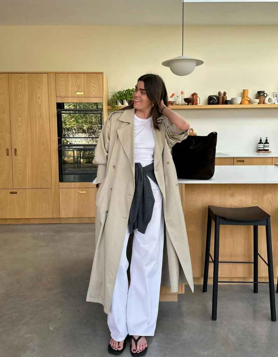 卡其色长风衣是经典单品,内搭白T恤和白色阔腿裤,上身舒服又随意,轻松穿出高级感。