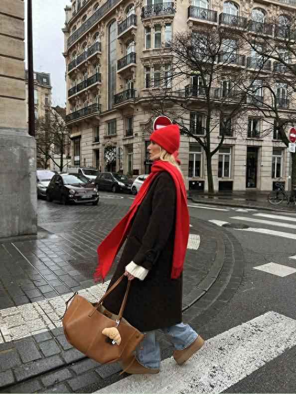 多投资一些基础款单品,永不过时。比如深棕色A字大衣,怎么穿都好看,搭配牛仔裤和勃肯鞋,轻松打造休闲感。再配上红色帽子和围巾,瞬间提升亮点。