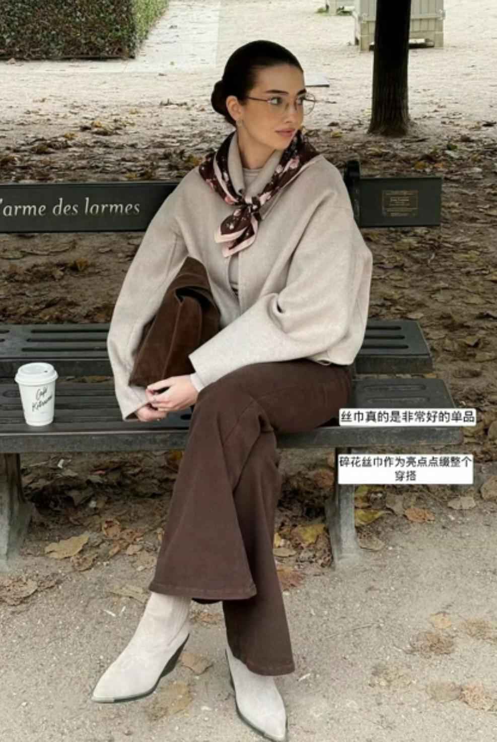 35岁以后,穿衣要懂得去繁存简,用基础款叠穿来增加层次感。廓形外套配直筒裤,系条丝巾更显优雅气质。