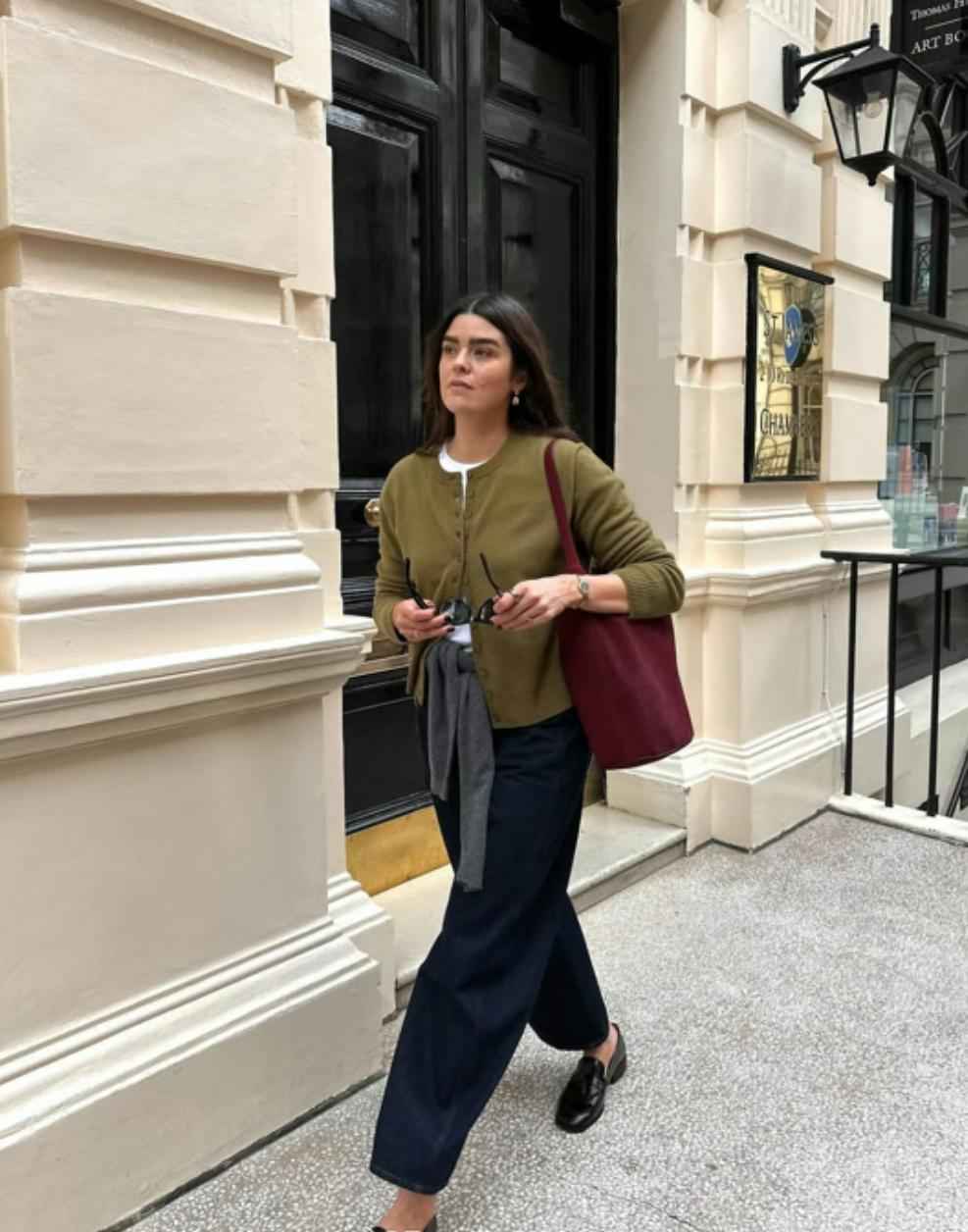 舒适的衣服才能穿得久,橄榄绿针织开衫叠穿白T恤,配九分哈伦裤,腰间系件衣服点缀,更显品味。