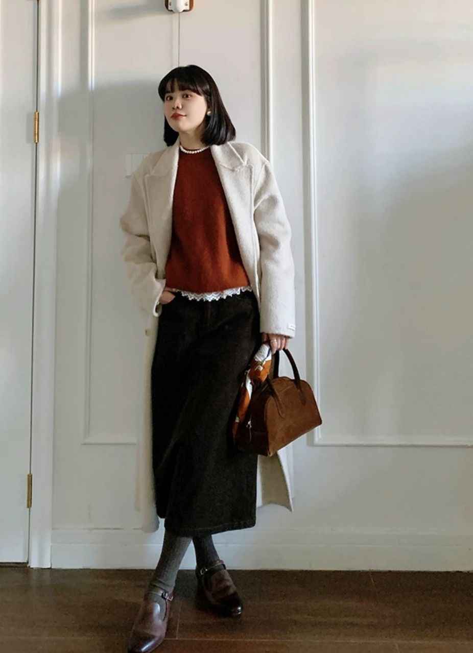 带黄调的棕色大衣简约又松弛,裹着穿时内搭棕色直筒裙和打底衫,配色分明,气质出众。