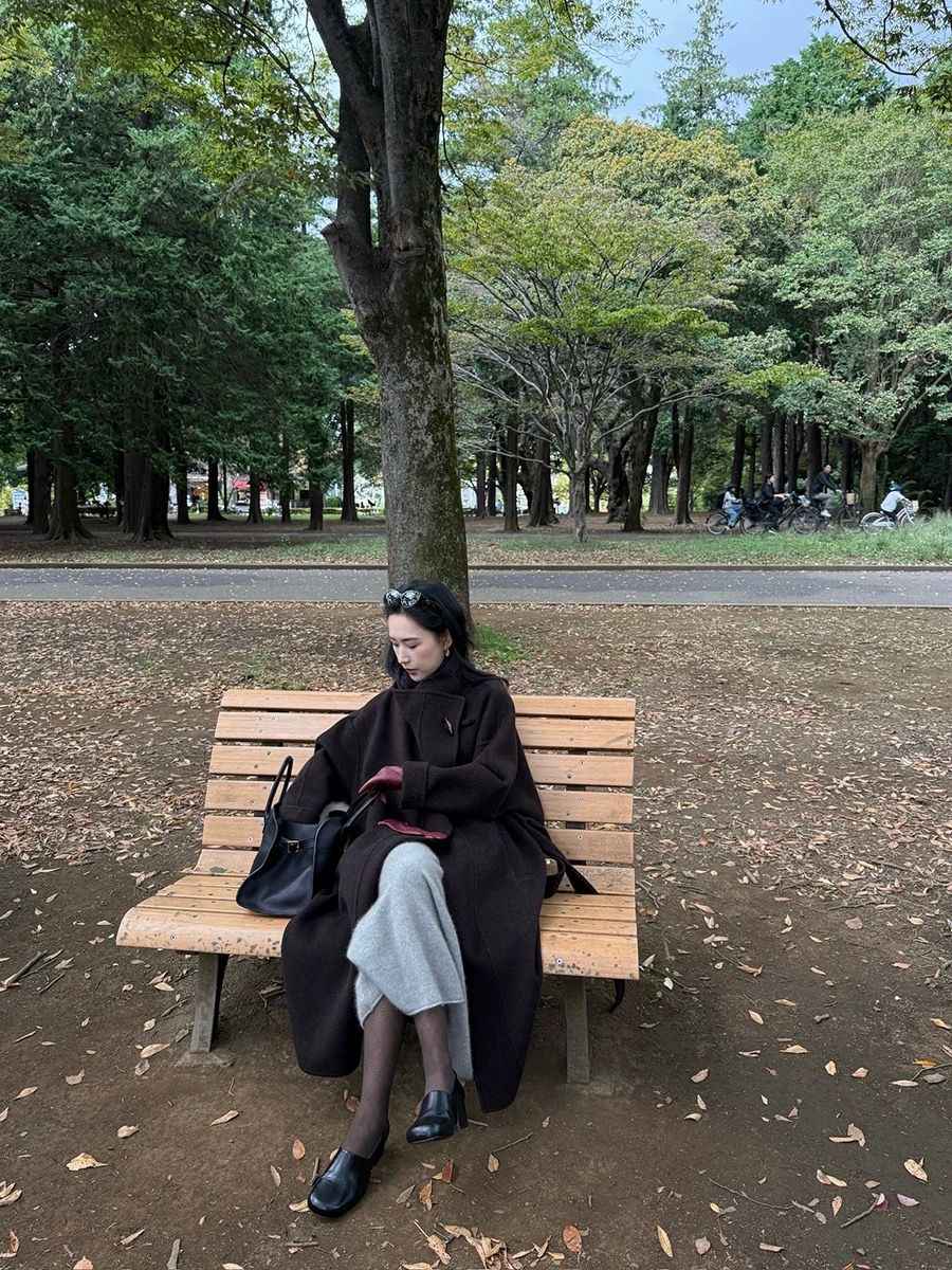 高智感穿搭能让你成为自己的大女主!深棕色羊绒大衣配灰色长裙,裙摆飘逸,浪漫又高级。