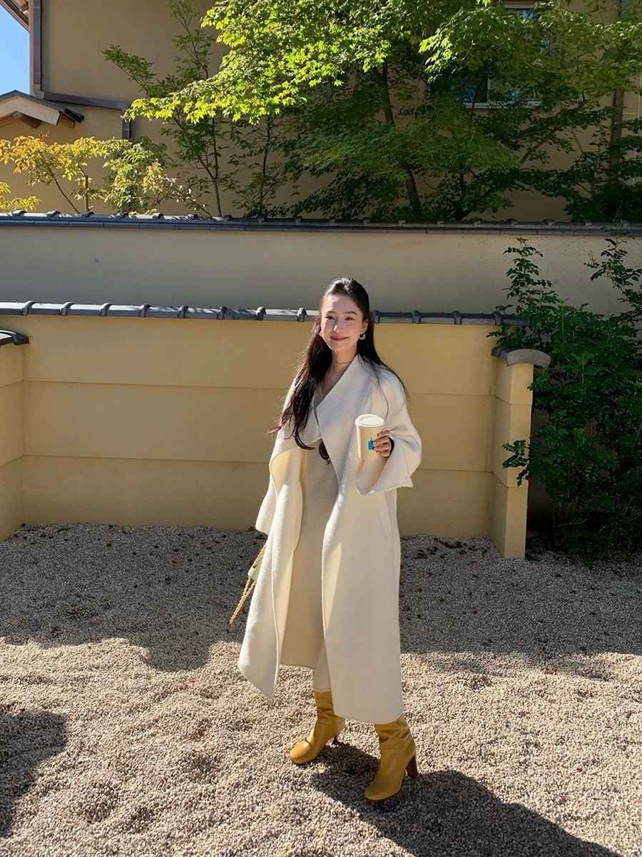 白色作为主色调时,氛围感自然来。白色大衣配连衣裙,搭姜黄色低跟靴,美得轻松。