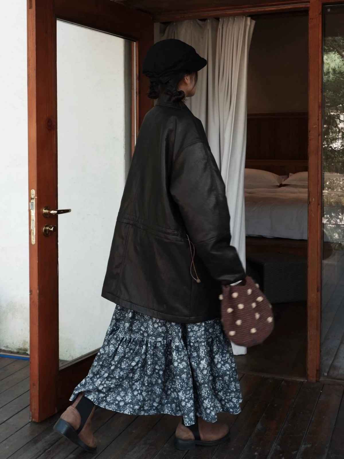 落肩设计的皮外套很适合搭配碎花半身裙,一半帅气一半浪漫,氛围感十足。