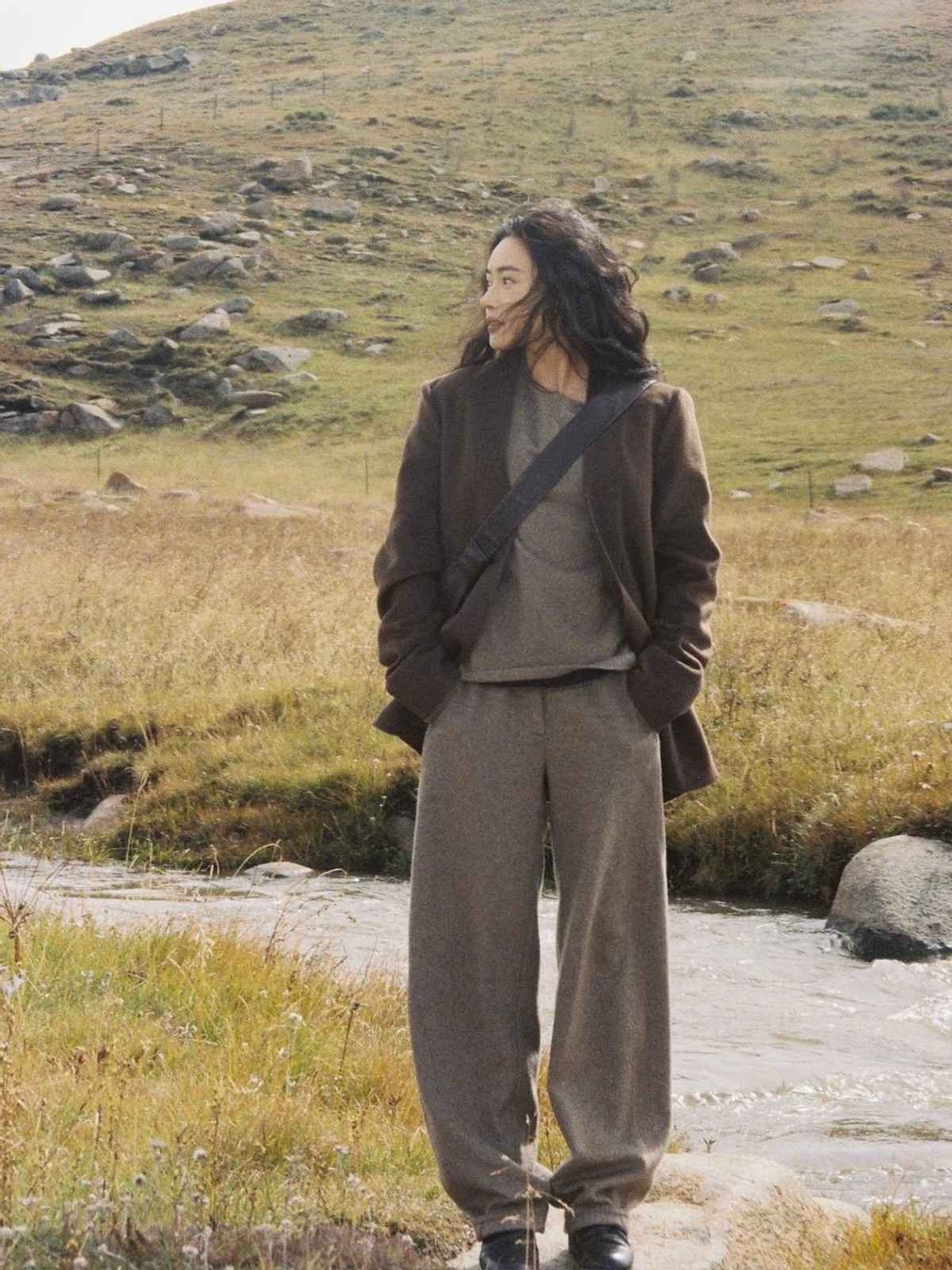 同色系穿搭以大地色为主,深棕色西装配灰棕色羊绒套装,既舒服又修饰身材。