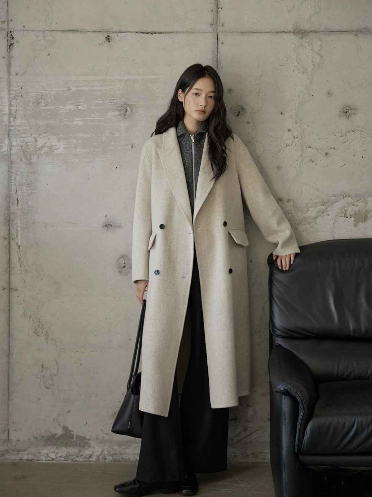 米灰色直筒大衣清爽不挑肤色,叠穿灰色翻领拉链毛衣,配黑色阔腿裤,韩范十足。