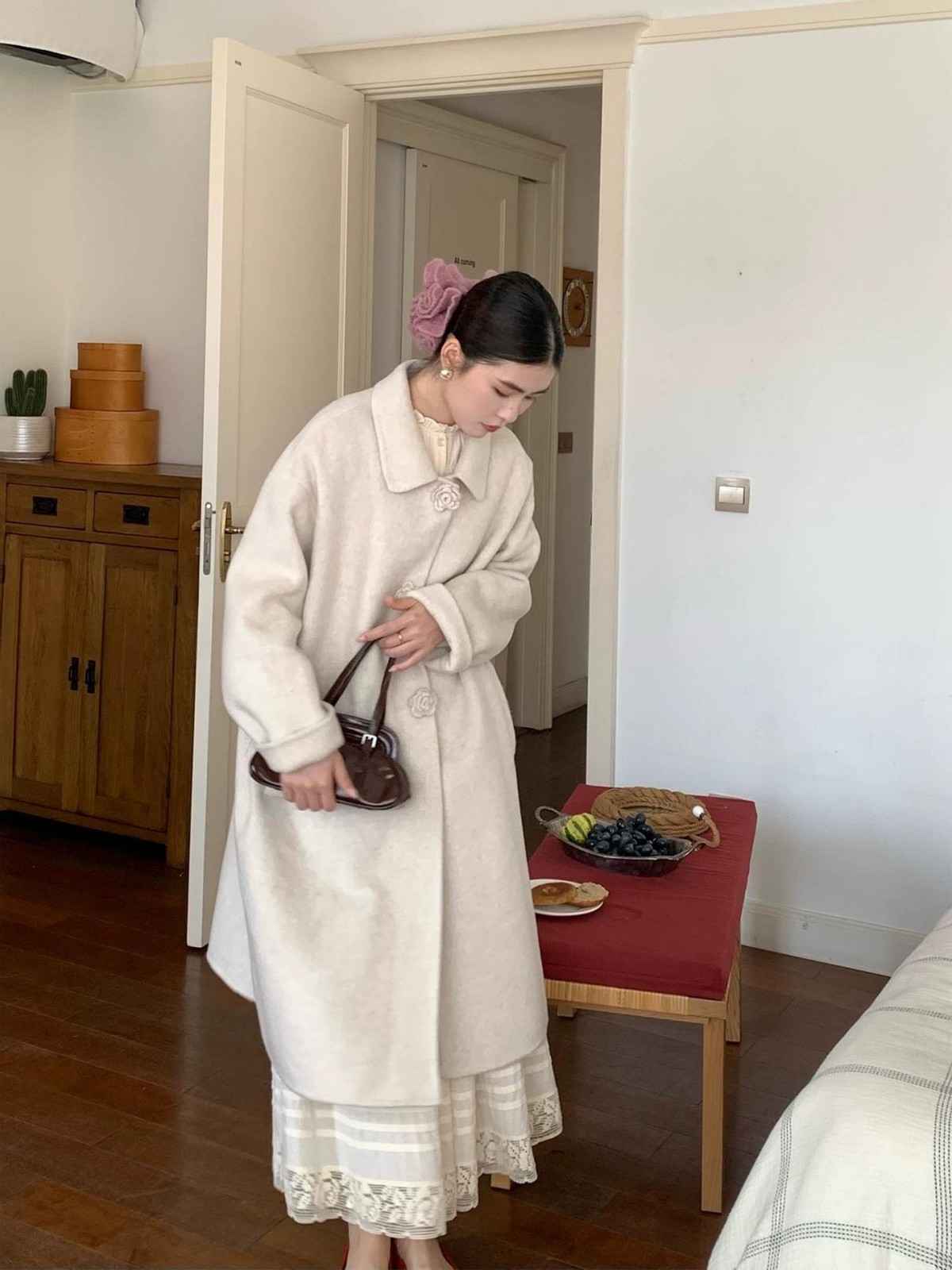 小个子穿搭要注重层次感,小翻领落肩大衣叠穿蕾丝连衣裙,露出裙摆,温柔有气质。