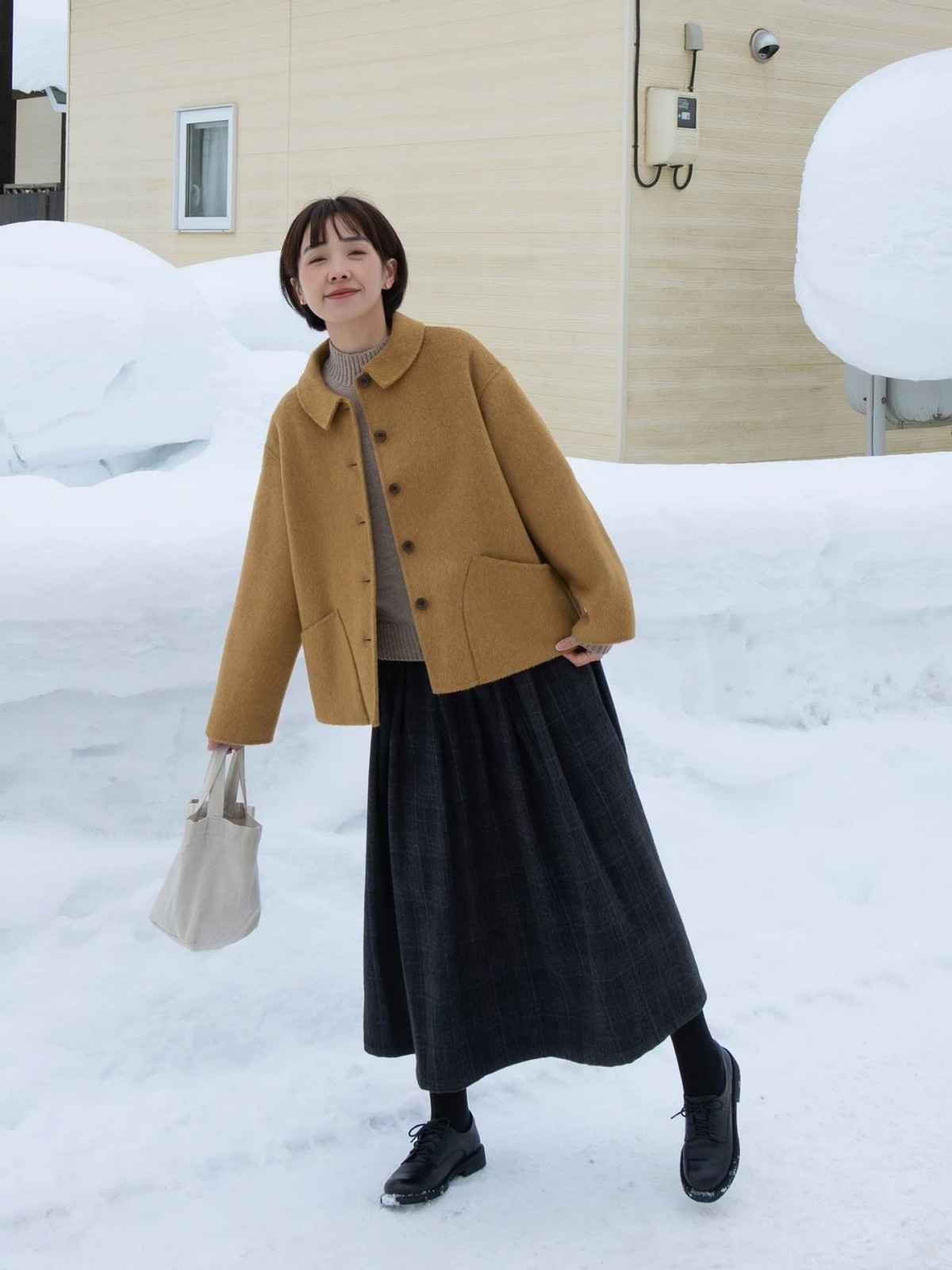 黄色翻领短款落肩大衣宽松休闲,不挑身材,厚实面料保暖好,配A字格纹半身裙,回头率高。