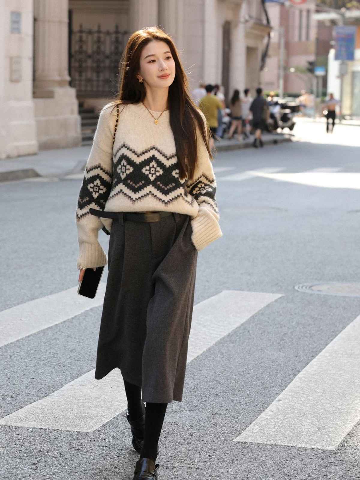 秋冬流行的费尔岛毛衣,肩部和下摆留白,清新大气,配毛呢七分裤和黑色裤袜,显腿细。