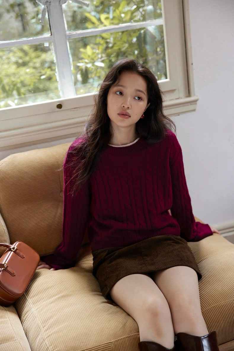酒红色圆领针织毛衣用粗针织设计,上半身更立体,配棕色灯芯绒短裙和光腿神器,时髦显腿长。