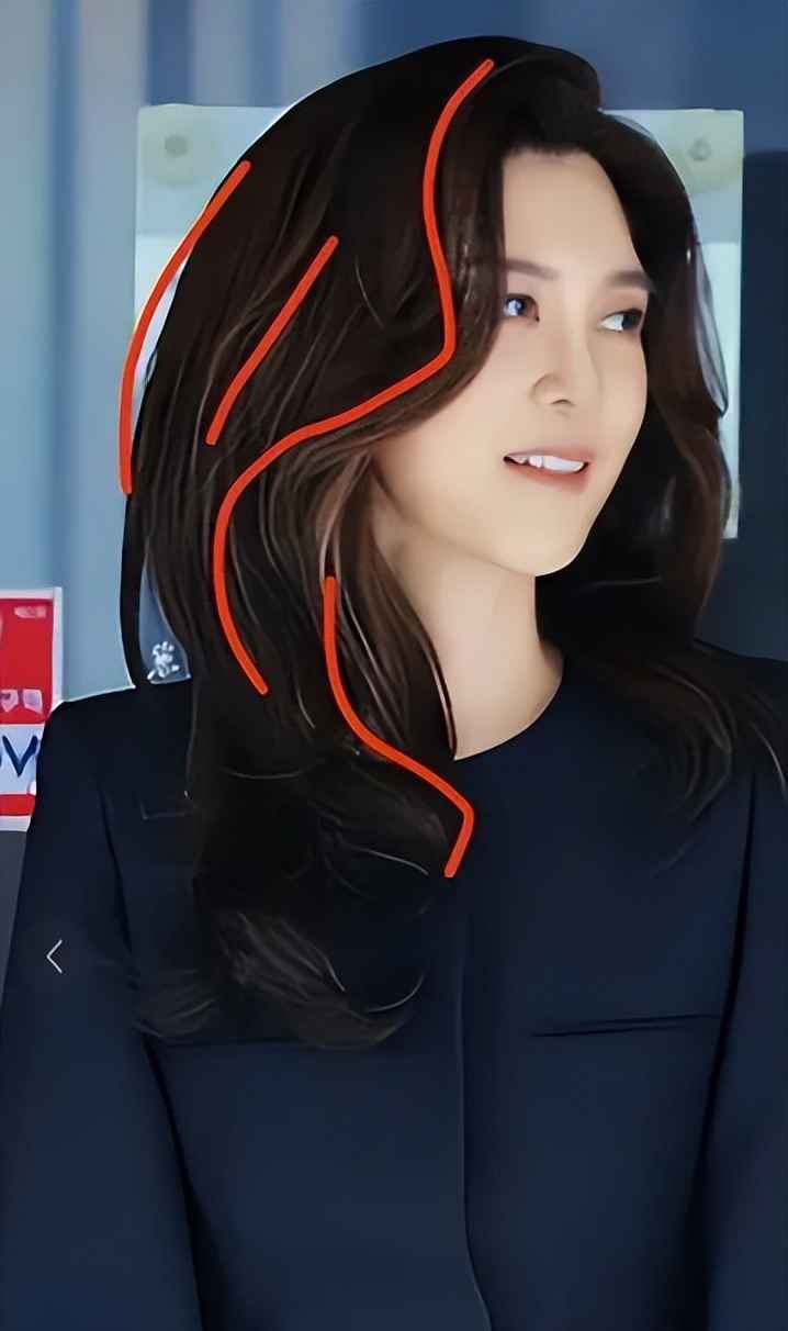 当穿领口较低、颈部留白多的衣服时,可以像李富真这样放下头发。但前提是头发必须蓬松。用卷发棒制造大卷,增加空气感。