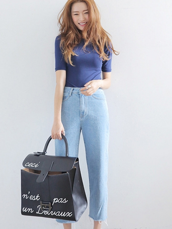 问: 买了一条款式简单的浅色直筒牛仔裤,感觉太普通了,怎么用上衣穿出惊艳感?