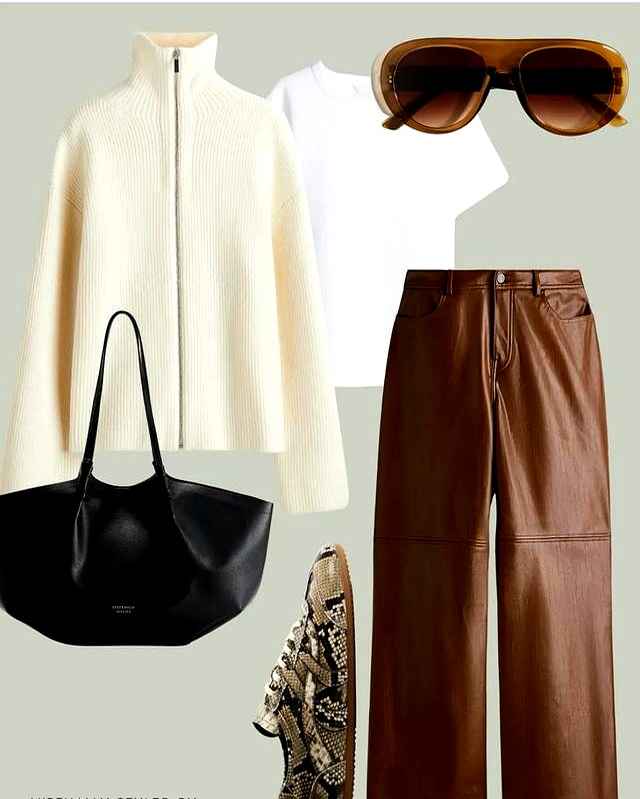 解读:苔绿色毛衣配巧克力色皮裤,光配色就高级感满满。把毛衣下摆塞进裤子一点,拉高腰线,办公室最潮的就是你。