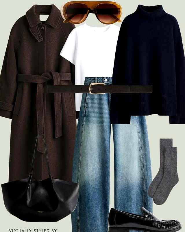 组合: 半高领打底 + 直筒牛仔裤 + 短靴 + 羊毛大衣
