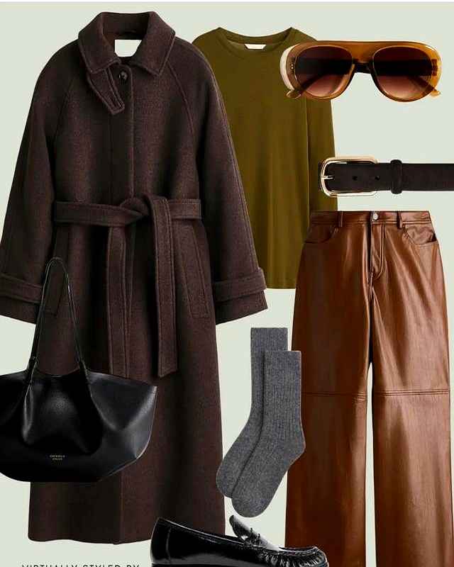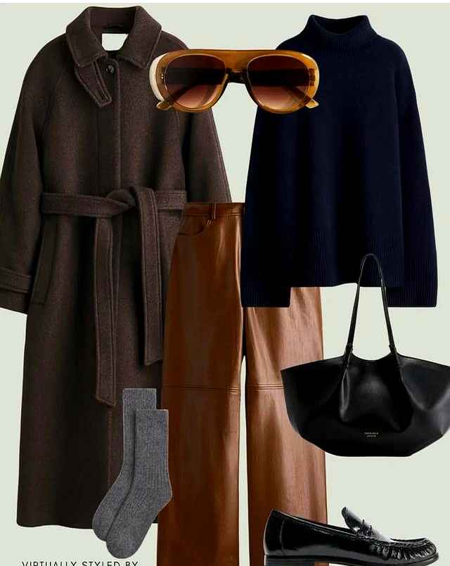 解读:这是最经典的搭配,大气不出错。大衣的稳重配上皮裤的帅气,气场全开。半高领内搭过渡自然,保暖又有型。拎上托特包,职场女强人范儿十足。